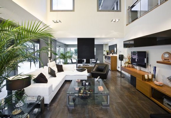 Man geht in die Hauptetage durch eine Eingangshalle, die sich über einen begrünten Innenhof erstreckt. Diese Etage besteht auch aus vier Schlafzimmern, vier Badezimmern, einer Küche und einem grosszügigen Wohn-/ Esszimmer zum Garten orientiert und mit einem aufgehängten Kamin. Solarmodule versorgen dem Haus mit zusätzlichem Strom. Im Obergeschoss stehen ein Büro, ein Zimmer oder Raum, ein Badezimmer und eine Terrasse mit schöner Aussicht zur Verfügung.