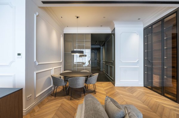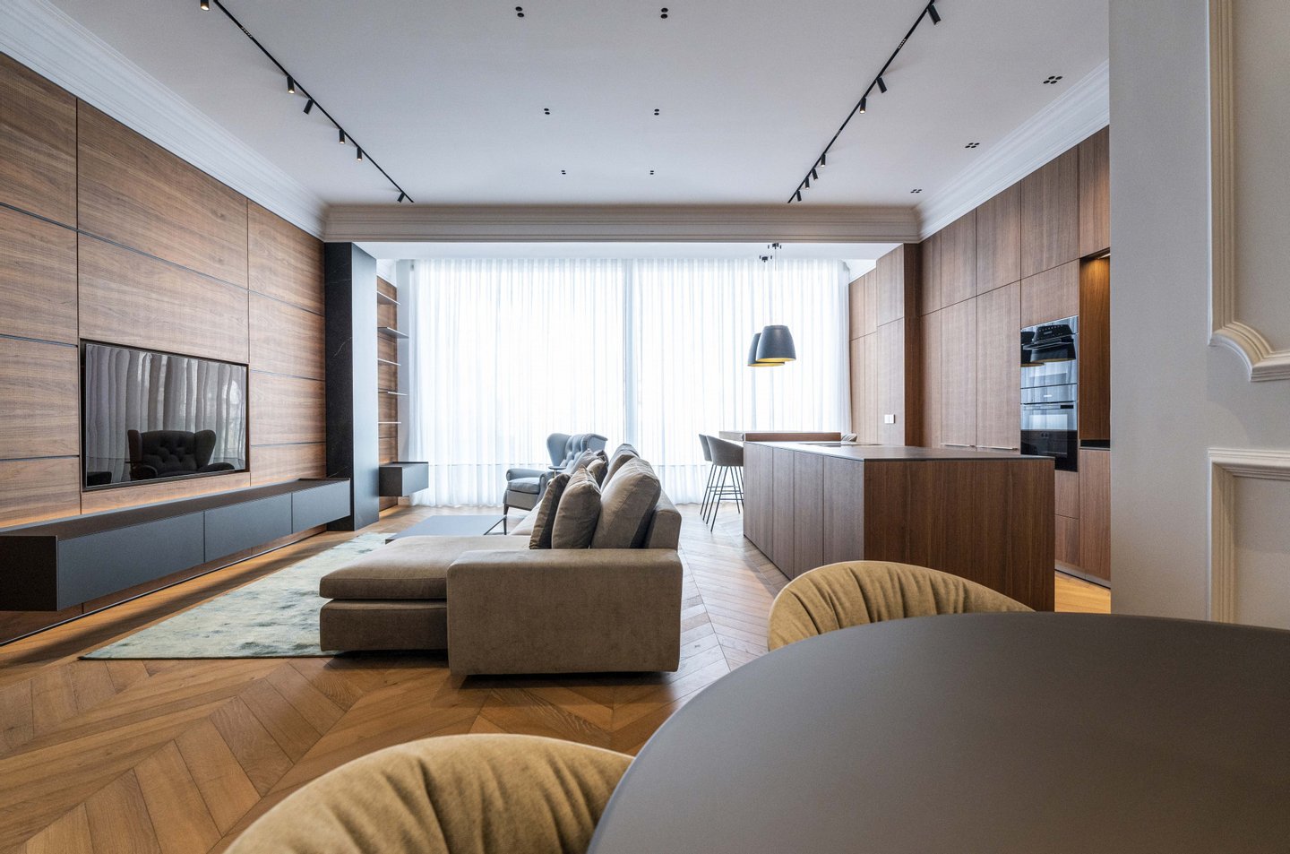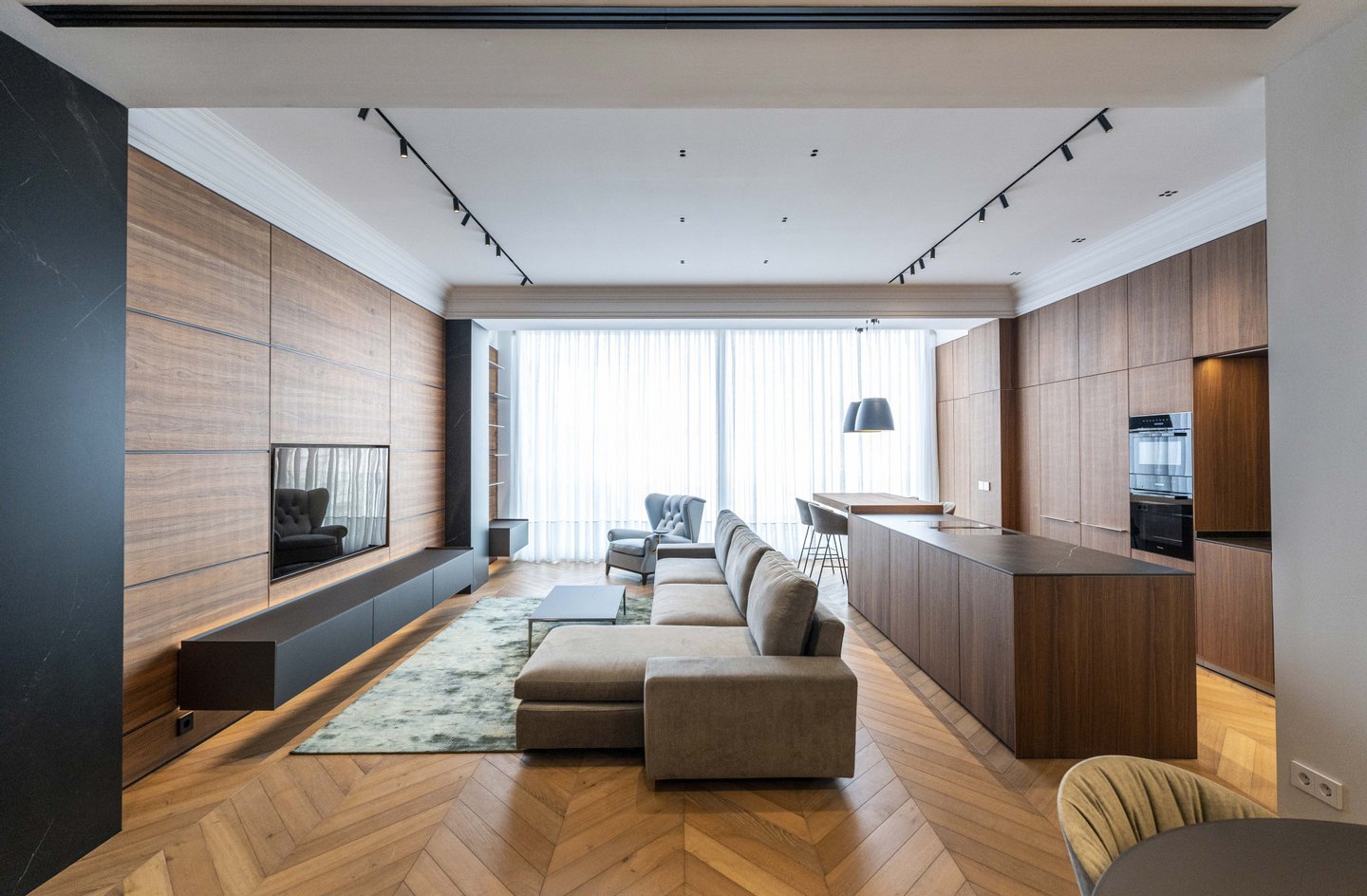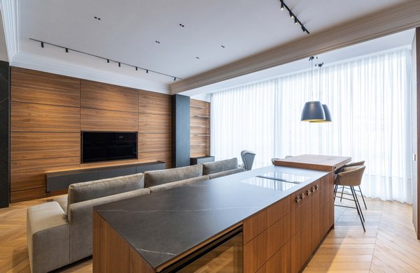 Die offene Küchenlounge befindet sich im Inneren der Wohnung, ausgerichtet auf den Innenhof der Äpfel, und verfügt über große Fenster, die natürliches Licht bieten.