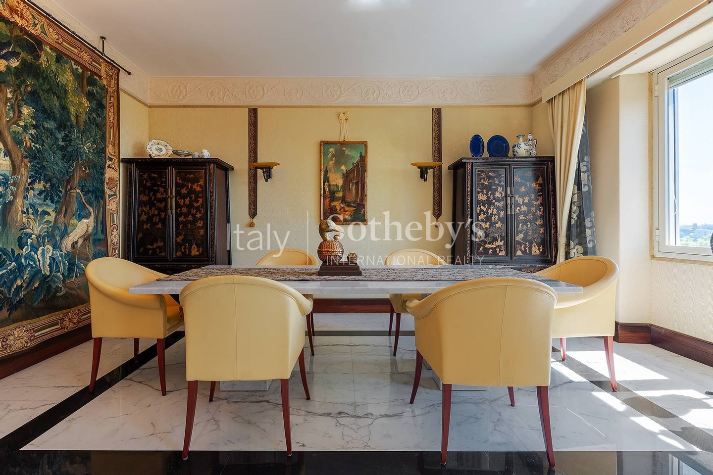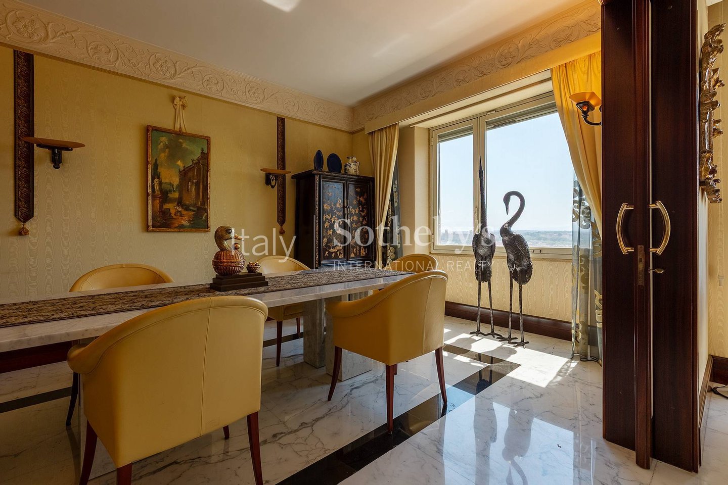 Die Immobilie ist geschmackvoll im klassischen Stil mit hochwertigen Antiquitäten eingerichtet und zeichnet sich durch Eleganz, Helligkeit und Ruhe aus. Das absolute Highlight ist der eindrucksvolle 180°-Panoramablick über Rom - ein Alleinstellungsmerkmal dieser besonderen Wohnung.