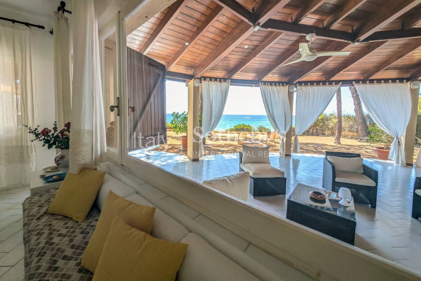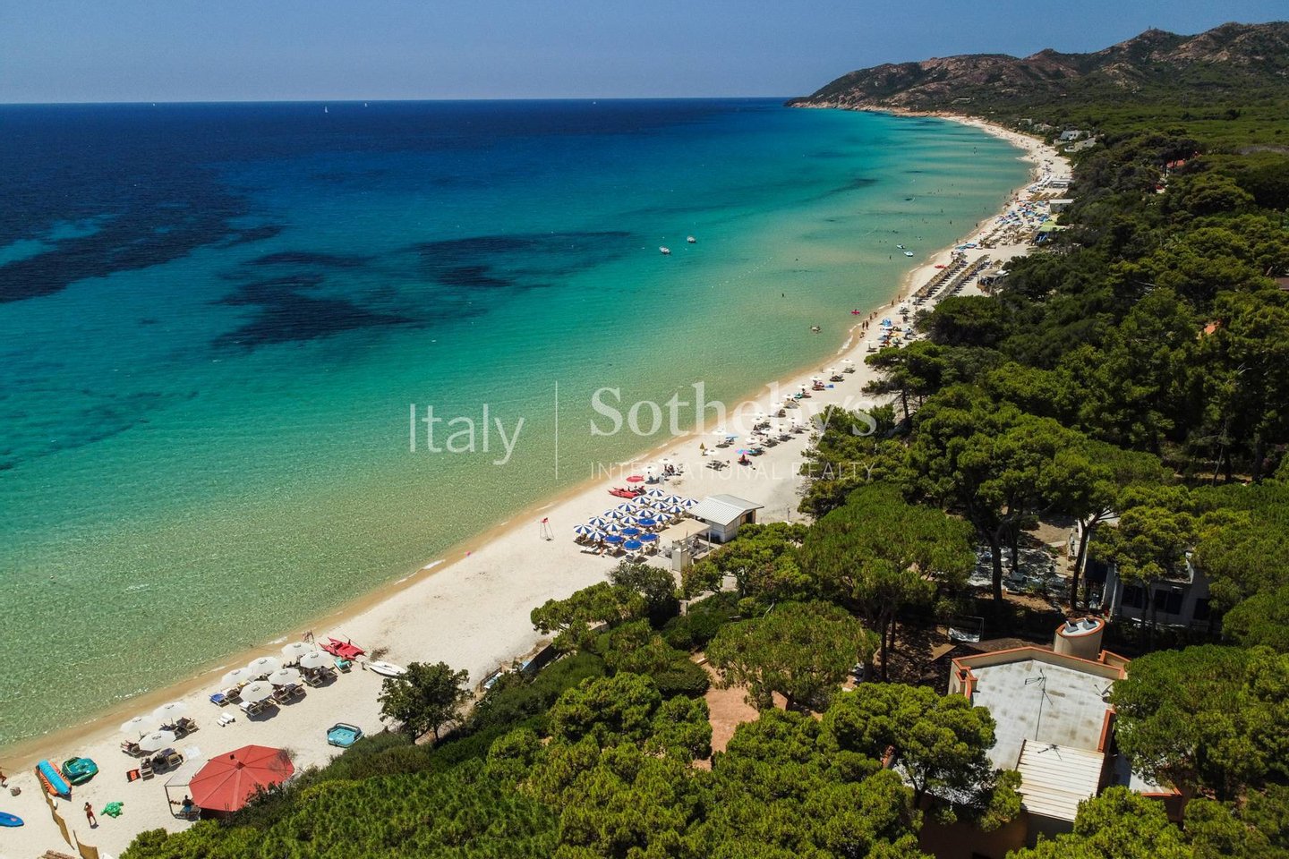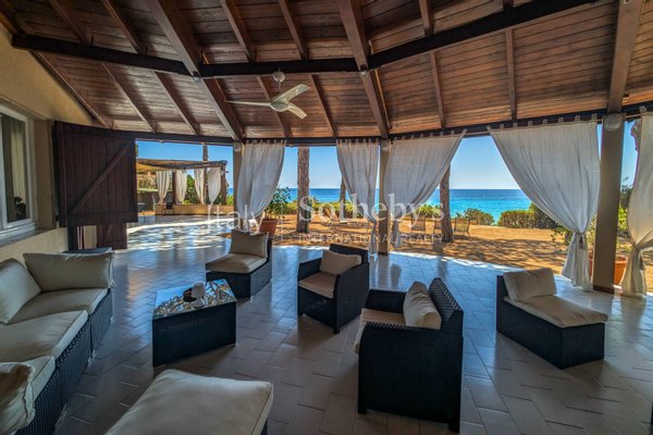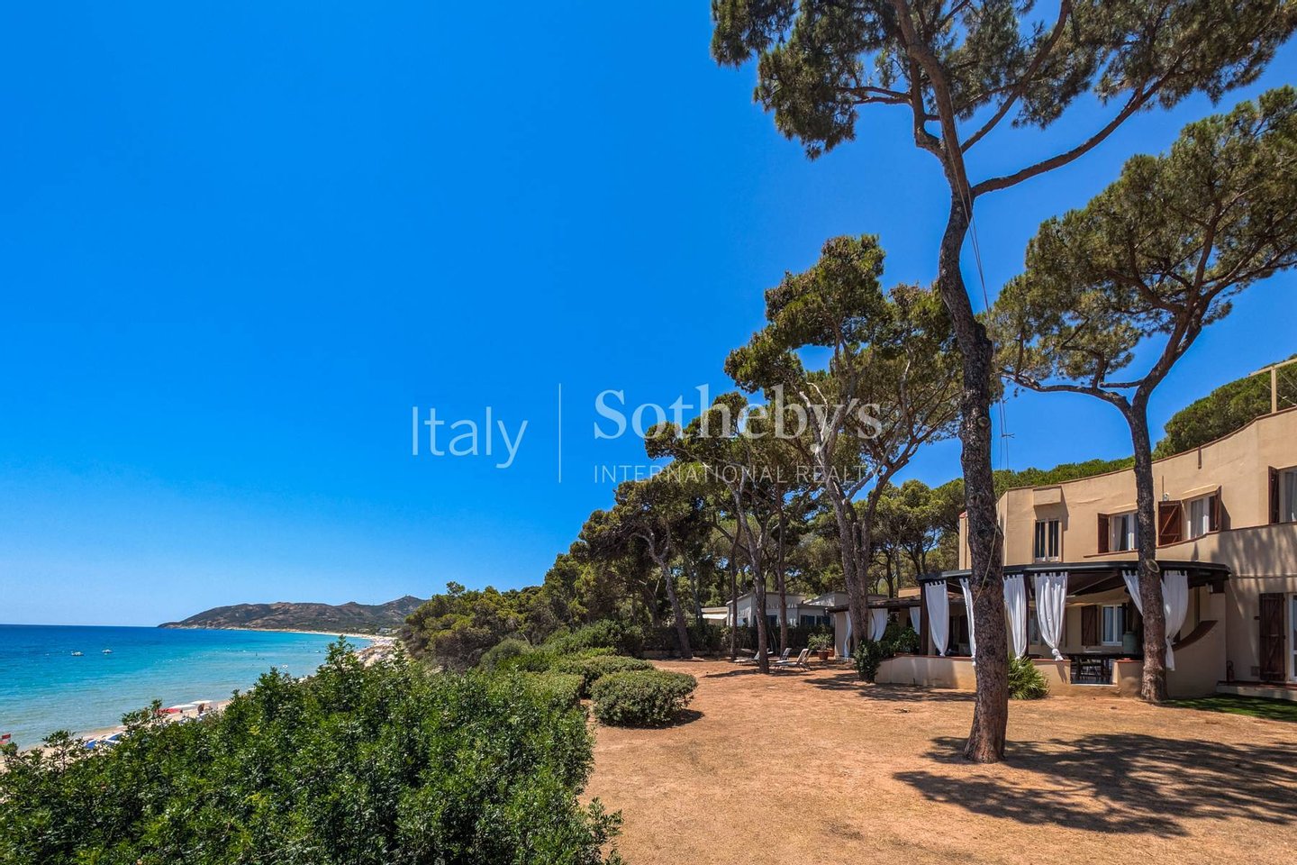 An einem der schönsten Strände der Südküste Sardiniens, direkt neben einem exklusiven Resort, befindet sich diese Villa mit spektakulärem Meerblick.