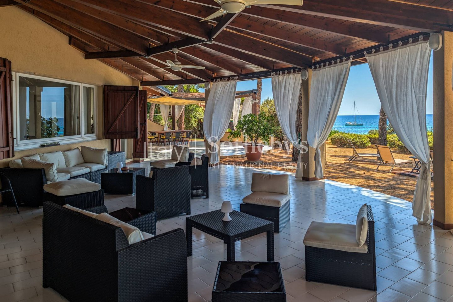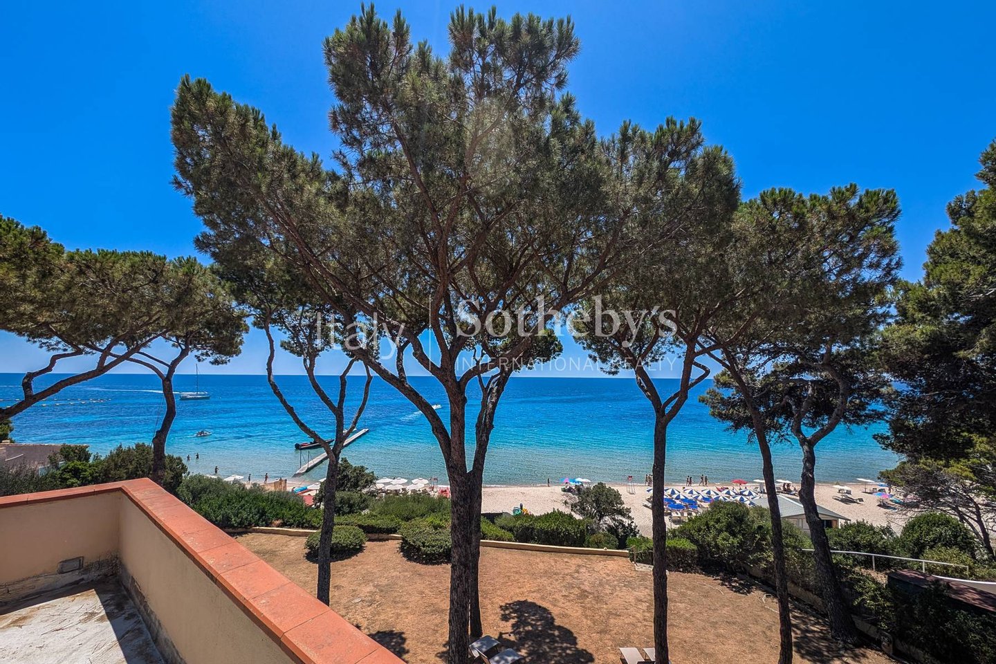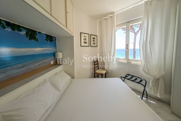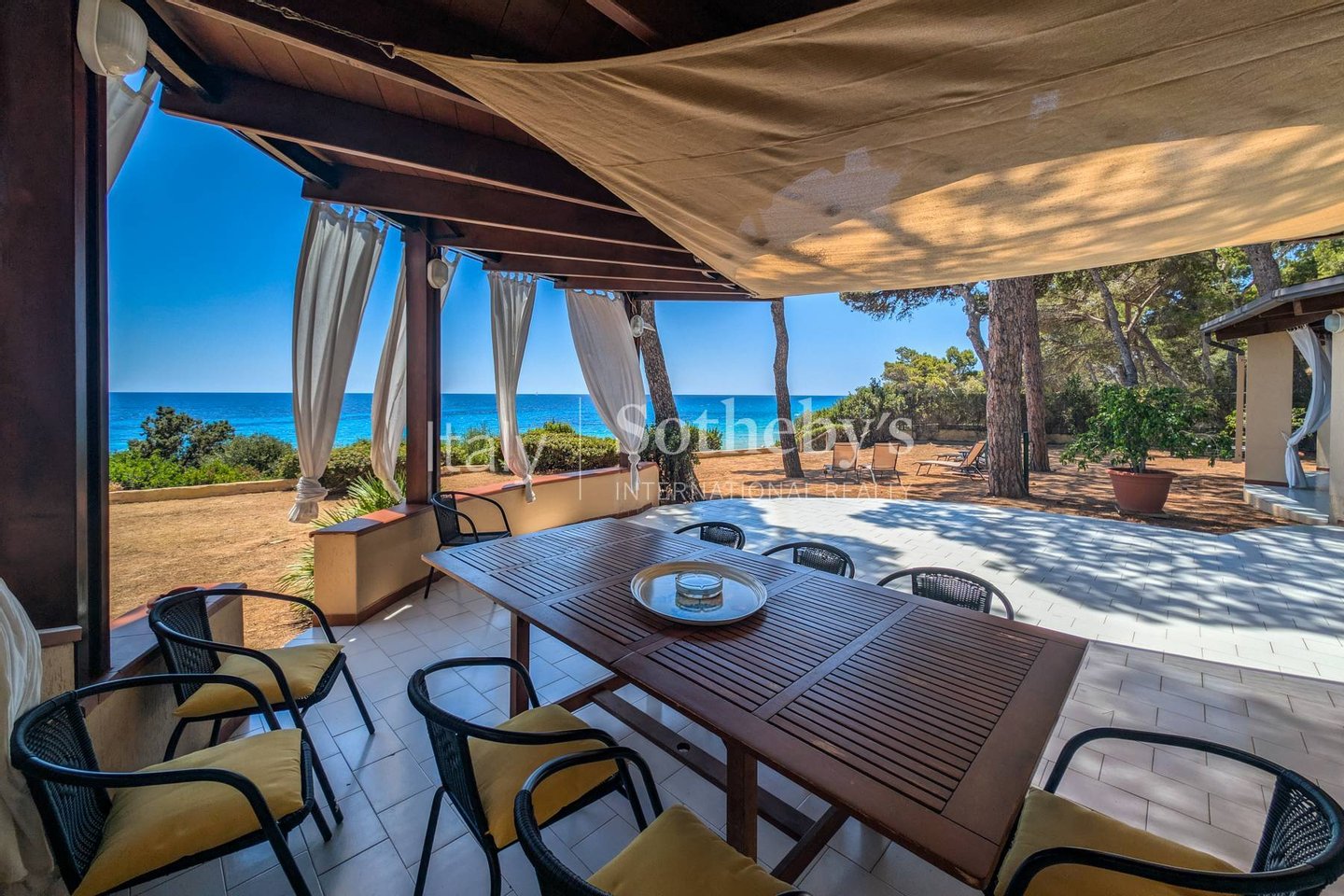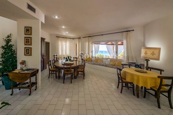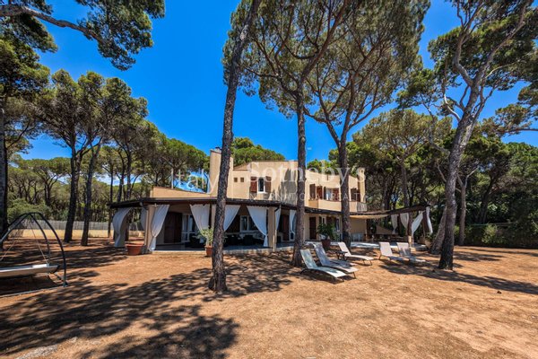 Umgeben von einem 1.800 m² großen Garten und beschattet von mediterranen Pinien, bietet sie einen direkten Zugang zum Strand über eine private Treppe. Im Erdgeschoss öffnen sich großzügige, überdachte Terrassen zum Garten und zum Meer. Innen erwartet Sie ein weitläufiger Wohnbereich mit Salon, Esszimmer, Küche, Gäste-WC und einem Schlafzimmer mit eigenem Bad.