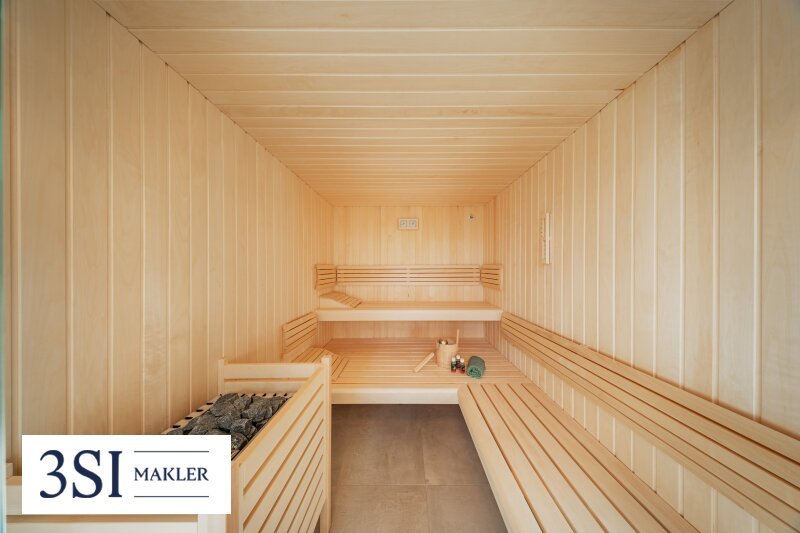 Untergeschoß: Schlafzimmer, Bad mit Dusche, Wanne und WC, Sauna, Ruhebereich mit Dusche, Technikraum, WC, Zugang zum Pool und 192 m² Garten