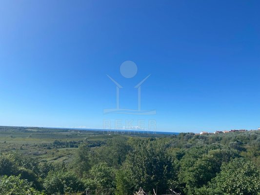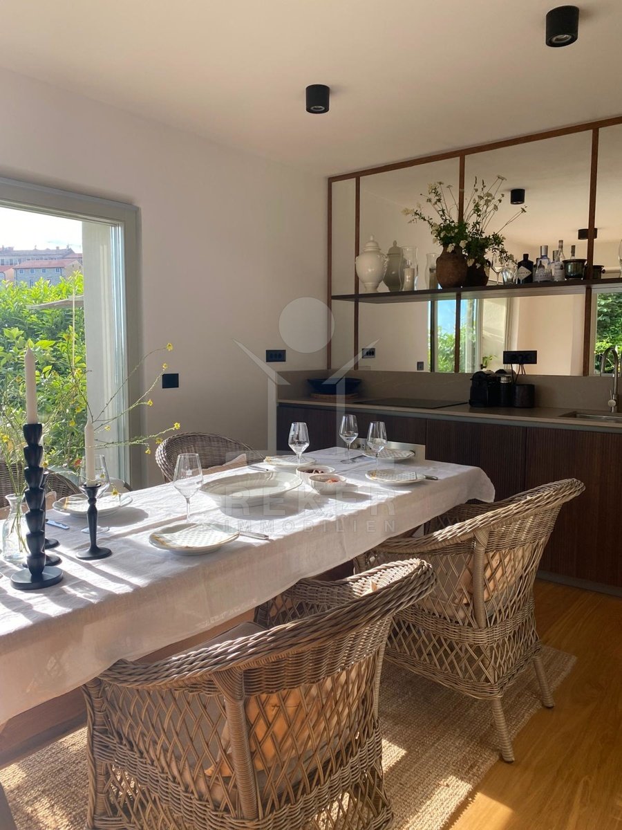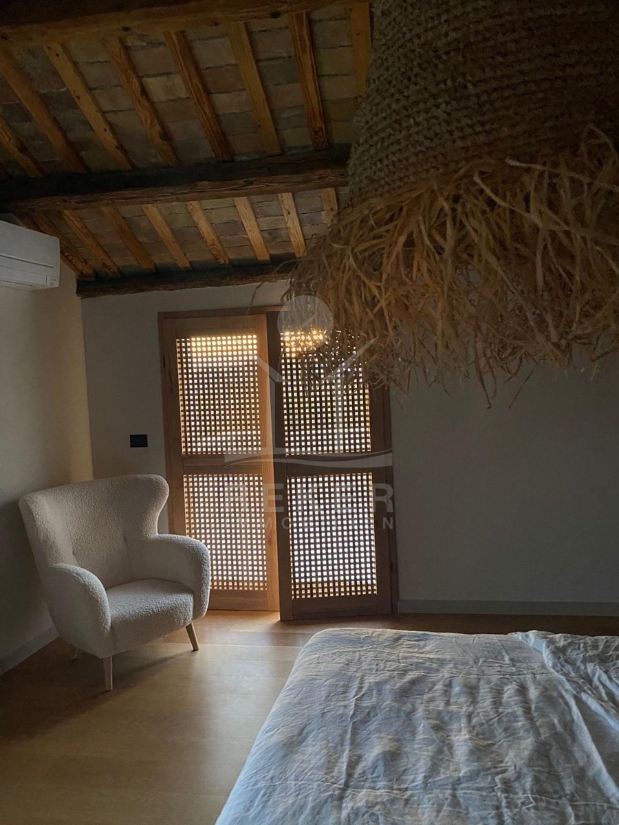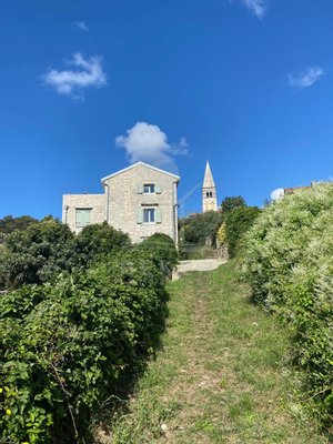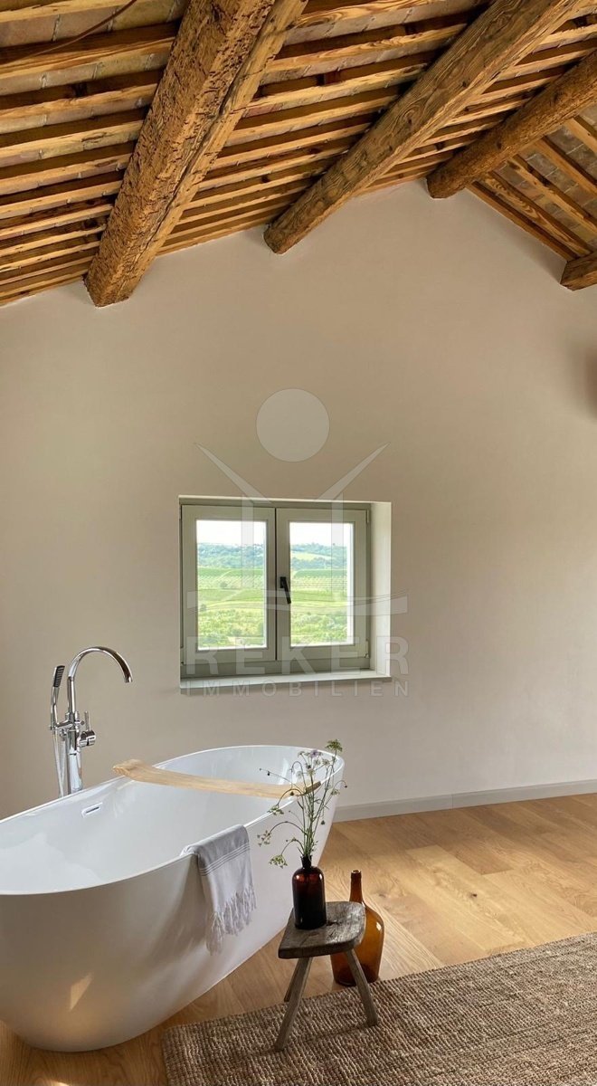 Mitten in Buje – aber nicht mittendrin. Dieses Haus liegt ruhig und unaufgeregt in einer kleinen Gasse der Altstadt. Hier mischt sich Ursprünglichkeit mit Alltagstauglichkeit: alles in Laufweite, von der Schule bis zur Bank. Doch sobald man durch das Tor tritt, ist da nur noch Grün. Und dieser Ausblick: weit über Hügel und Felder, bis zum glitzernden Horizont.