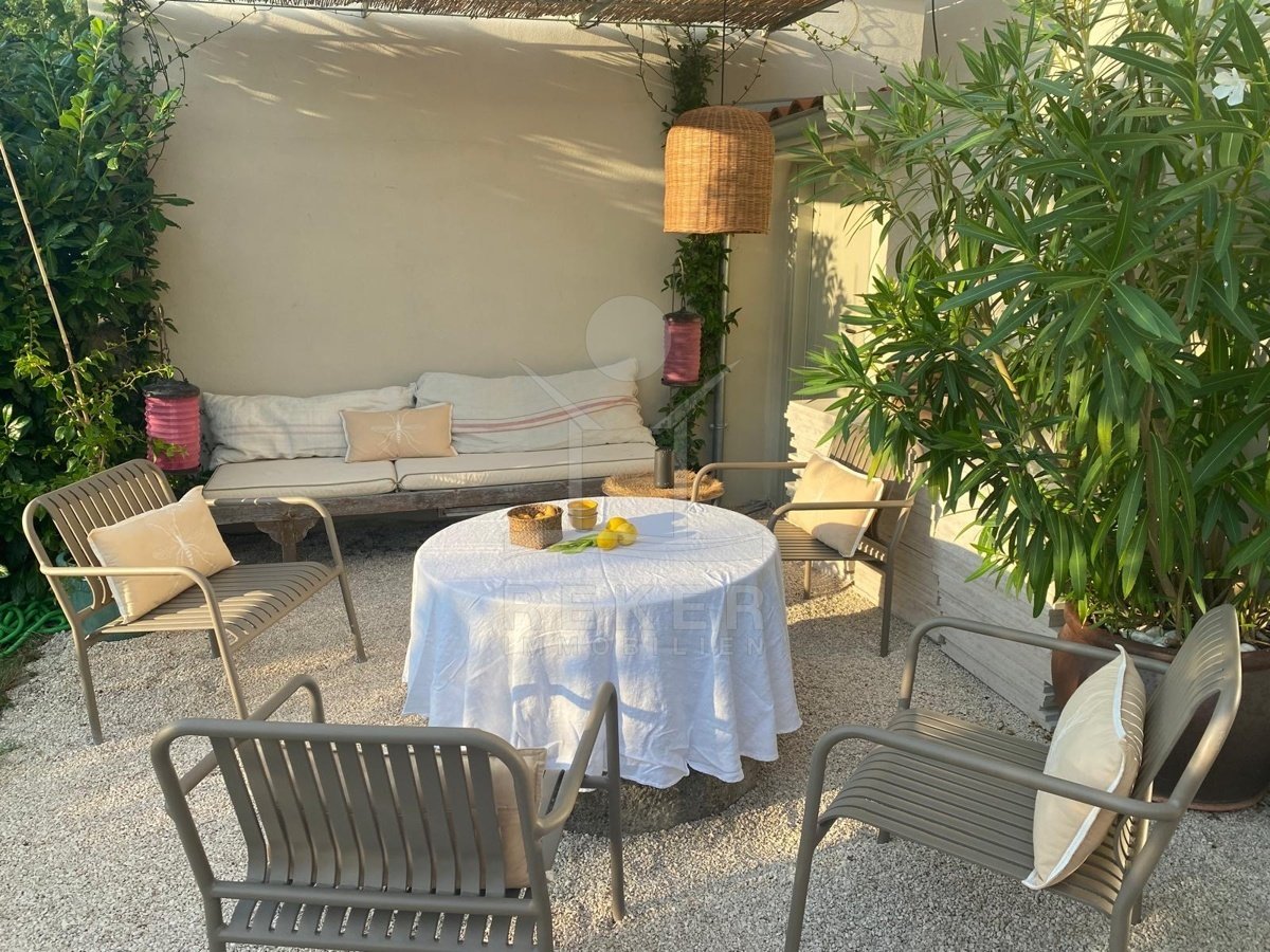 Mitten in Buje – aber nicht mittendrin. Dieses Haus liegt ruhig und unaufgeregt in einer kleinen Gasse der Altstadt. Hier mischt sich Ursprünglichkeit mit Alltagstauglichkeit: alles in Laufweite, von der Schule bis zur Bank. Doch sobald man durch das