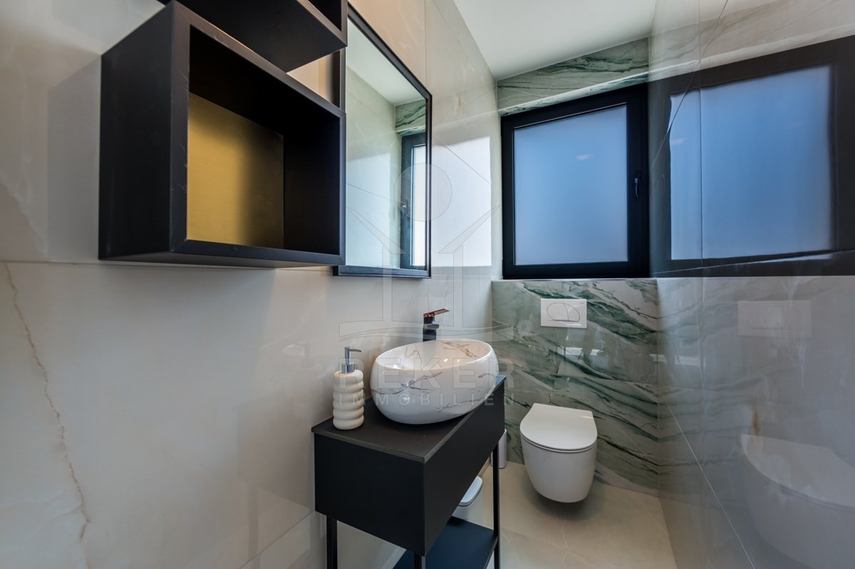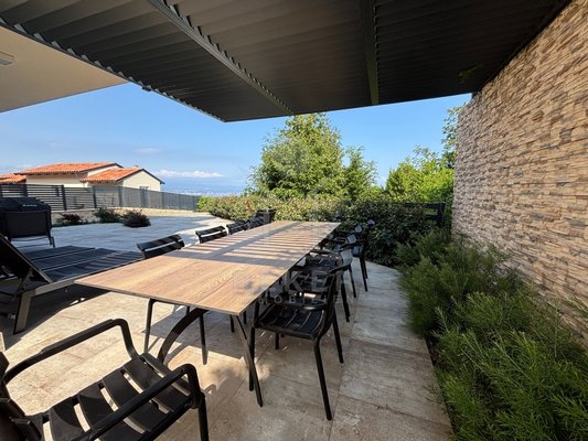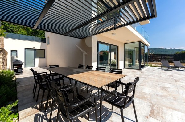Grüne Hügel, absolute Ruhe und ein freier Blick auf die Kvarner Bucht … nur wenige Minuten oberhalb von Lovran. Diese Villa liegt in einer kleinen Seitenstraße, umgeben von Natur und hochwertiger Nachbarschaft. Die Nähe zu Opatija, die Aussicht auf das Meer und die entspannte Lage machen sie zu einer echten Ausnahmeimmobilie. Im Garten selbst laden ein schattiger Essplatz, die Sommerküche und mediterrane Bepflanzung zum Draußensein ein. Auch praktisch: Die Garage ist direkt ans Haus angebunden.