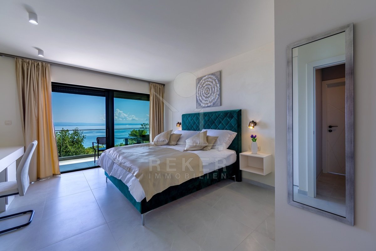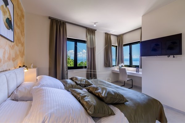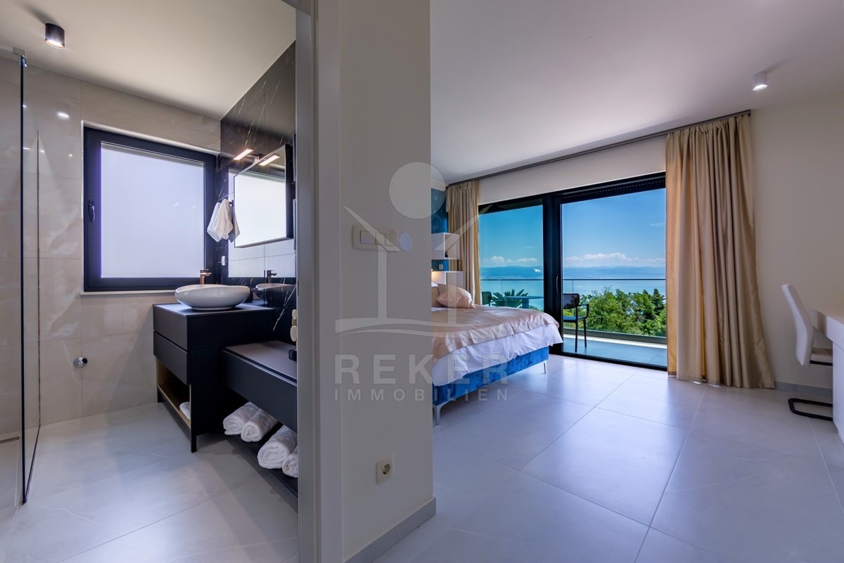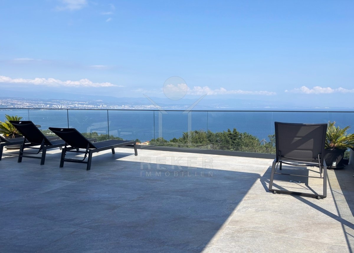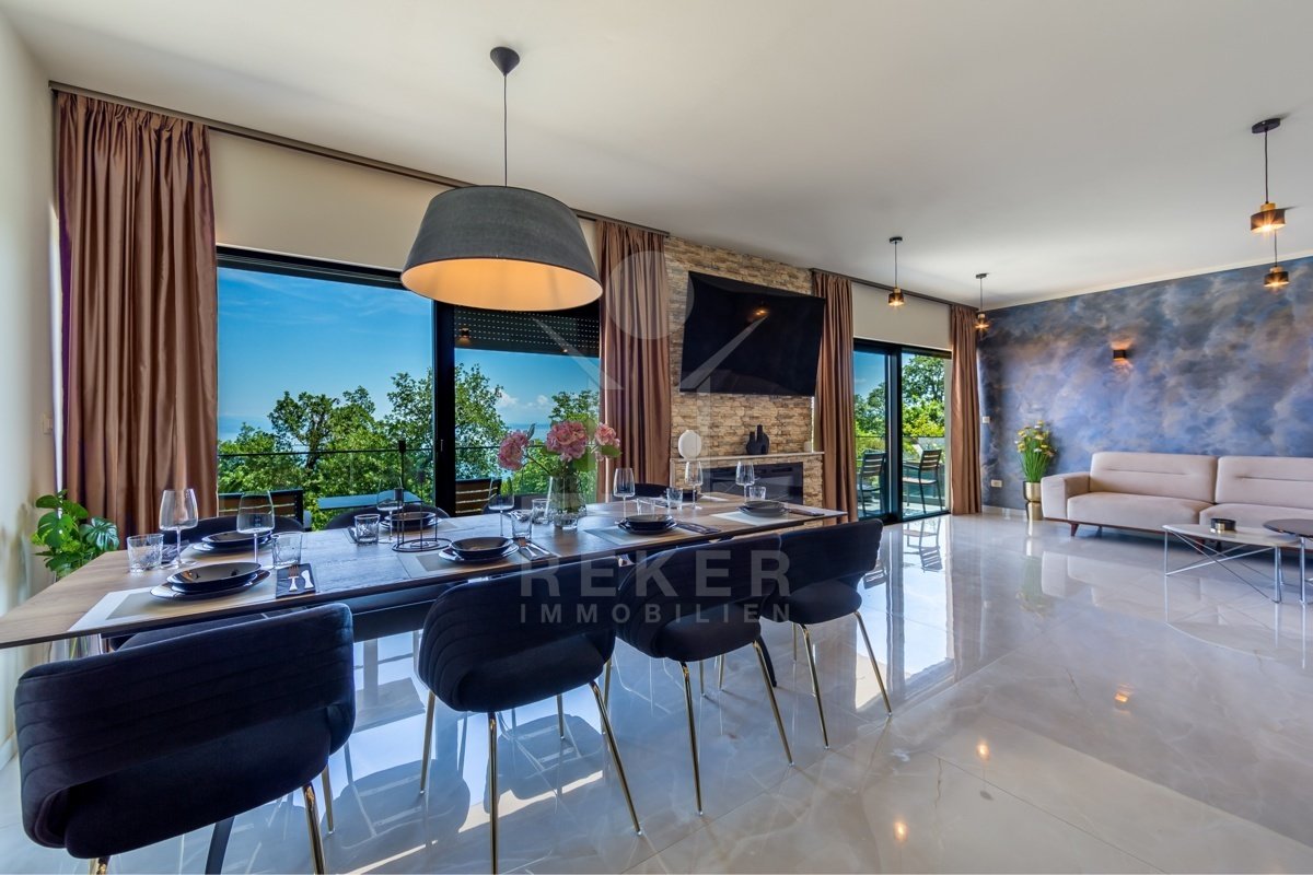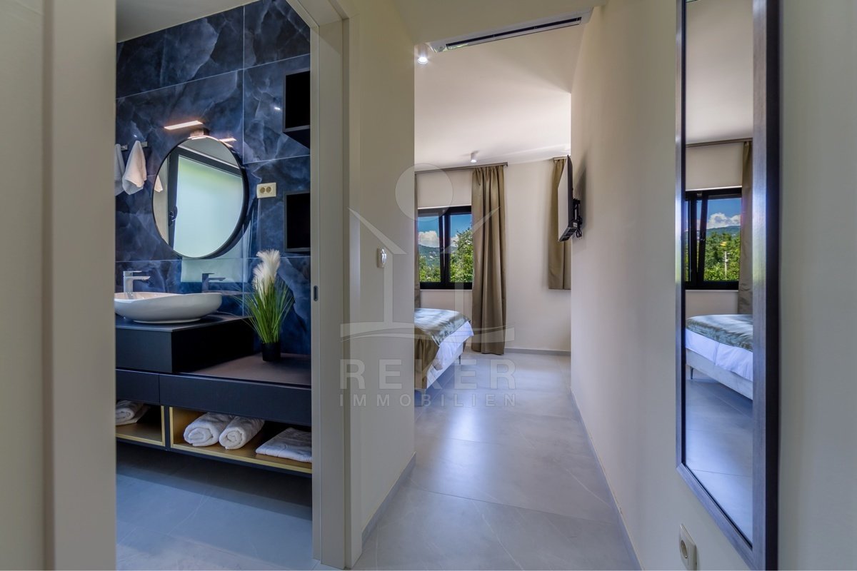 Grüne Hügel, absolute Ruhe und ein freier Blick auf die Kvarner Bucht … nur wenige Minuten oberhalb von Lovran. Diese Villa liegt in einer kleinen Seitenstraße, umgeben von Natur und hochwertiger Nachbarschaft. Die Nähe zu Opatija, die Aussicht auf