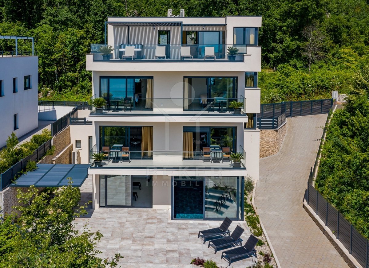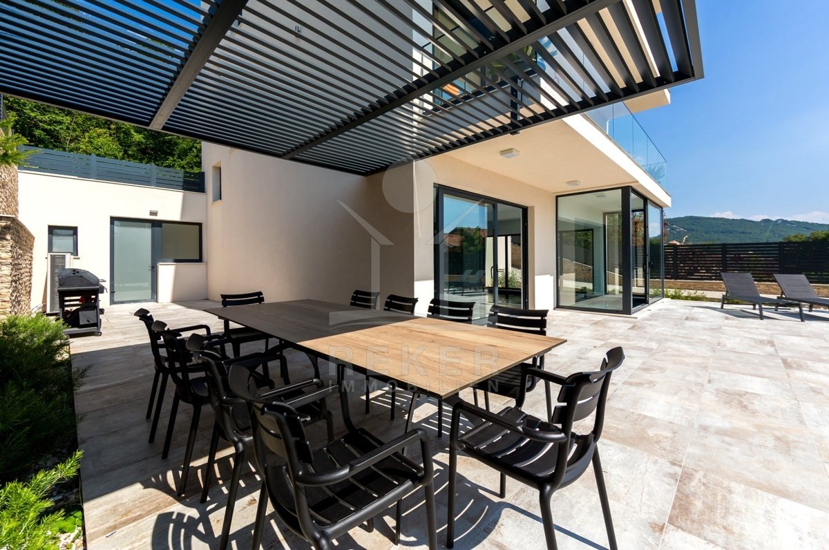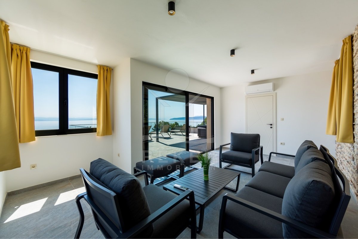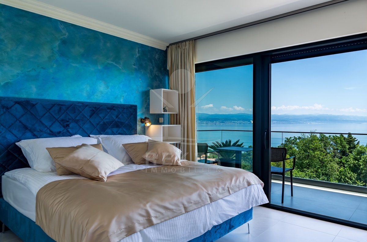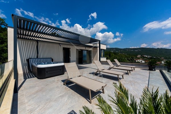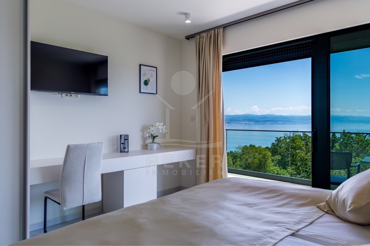 Grüne Hügel, absolute Ruhe und ein freier Blick auf die Kvarner Bucht … nur wenige Minuten oberhalb von Lovran. Diese Villa liegt in einer kleinen Seitenstraße, umgeben von Natur und hochwertiger Nachbarschaft. Die Nähe zu Opatija, die Aussicht auf
