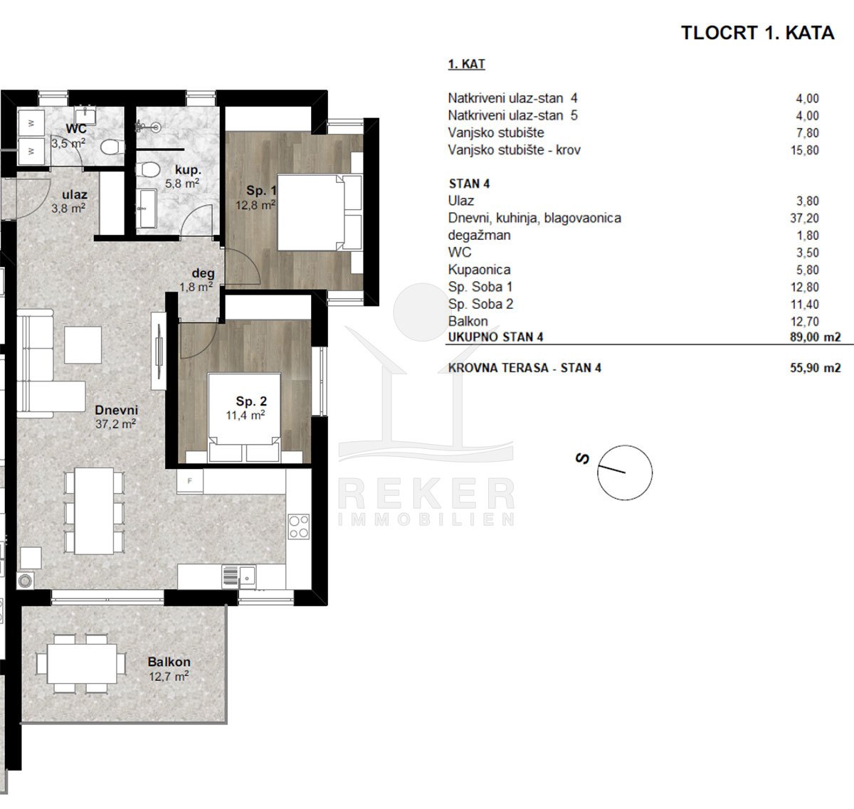 Ein echtes Highlight wartet oben: Ihre private Dachterrasse mit über 55 m² Fläche. Der Blick reicht bis zum Meer… viel Platz für Sonnenliegen, Lounge, Grill oder große Tafel. Hier verbringen Sie den ganzen Sommer: privat, windgeschützt, mit Aussicht. Der zusätzliche Balkon an der Wohnung selbst ist wie gemacht für einen Kaffee am Morgen oder ein Glas Wein am Abend. Viel Außenfläche, ganz für Sie allein.