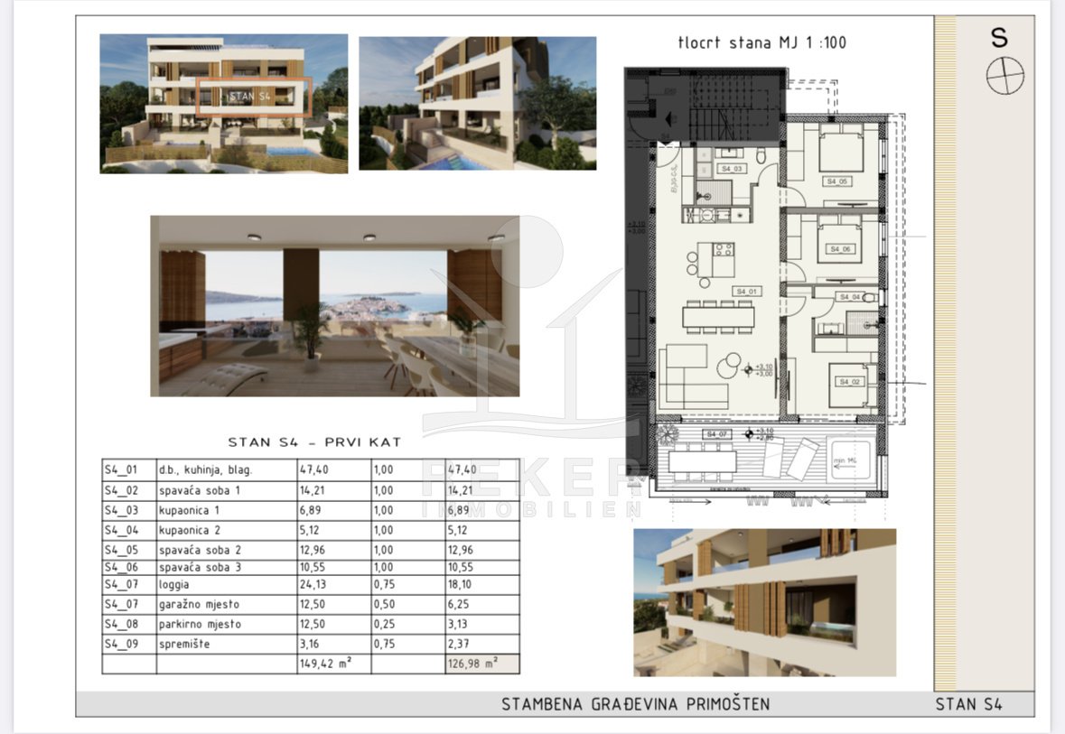 Primošten, ein Küstenort, der Ruhe und Meeresnähe verbindet. Nur rund 400 Meter trennen dieses Neubauprojekt vom Wasser. Die Lage ist ruhig und von Grün umgeben. Das Grundstück liegt in einer leichten Hanglage, was den Wohnungen einen schönen Blick und gute Belichtung ermöglicht. Fertigstellung: 2025. Insgesamt gibt es sieben Wohnungen, verteilt auf vier Etagen. Jede Etage beherbergt zwei Wohnungen, außer das oberste Geschoss: Dort liegt ein großzügiges Penthouse. Alle Einheiten sind bequem mit dem Aufzug erreichbar. Die Fassade ist hell, die Holz-Elemente geben dem Bau Charakter. Große Fenster bringen viel Licht nach innen. Im Erdgeschoss genießt jede Wohnung einen eigenen Pool. Jede Einheit verfügt über mindestens einen Garagenstellplatz, ein klarer Vorteil, besonders in Meeresnähe. Weitere Außenstellplätze stehen zusätzlich zur Verfügung.