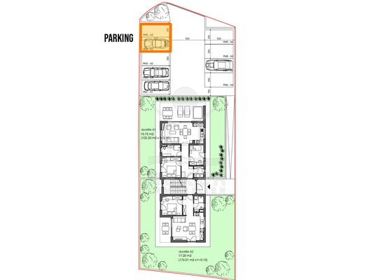 Das Wohngebäude ist modern geplant und wird aus hochwertigen Materialien gebaut. Es umfasst drei Etagen mit 6 Wohnungen, jede mit eigenem überdachtem Außenbereich. Die Architektur wirkt aufgeräumt und klar – mit viel Glas und Beton. Parkplätze sind für jede Wohnung vorgesehen, optional mit eigener E-Ladestation. Die gemeinschaftlichen Grünflächen werden über einen eigenen Trinkwasserbrunnen bewässert – das spart laufende Kosten und ist nachhaltig.