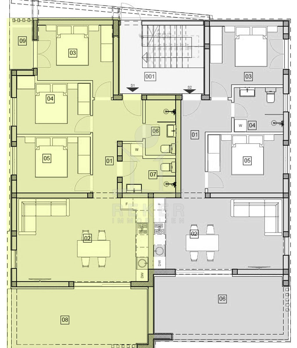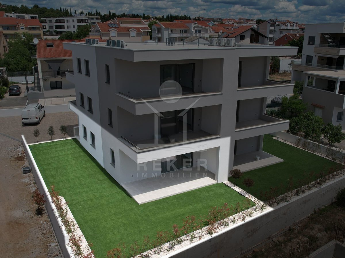 Vodice liegt an der dalmatinischen Küste – beliebt, gewachsen und dennoch ruhig. Genau dort entsteht dieses neue Wohnhaus. Das Meer ist in Sichtweite. Der nächste Strand? Frisch gestaltet und zu Fuß erreichbar. In der Nachbarschaft: neue Wohnhäuser, gepflegte Straßen, viele Einheimische, aber auch Ruhe für Zweitwohnsitz oder Rückzug. Das Gebäude hat drei Etagen und wirkt klar, modern und hochwertig. Sechs Wohnungen teilen sich den Neubau – jede mit großzügigen Außenbereichen. Die Fassade ist gedämmt, die Bauweise folgt modernen Standards. Vor dem Haus: gepflasterte Stellplätze, rundherum gepflegte Grünfläche mit niedriger Begrenzungsmauer. Ruhige Atmosphäre. Solide Privatsphäre.