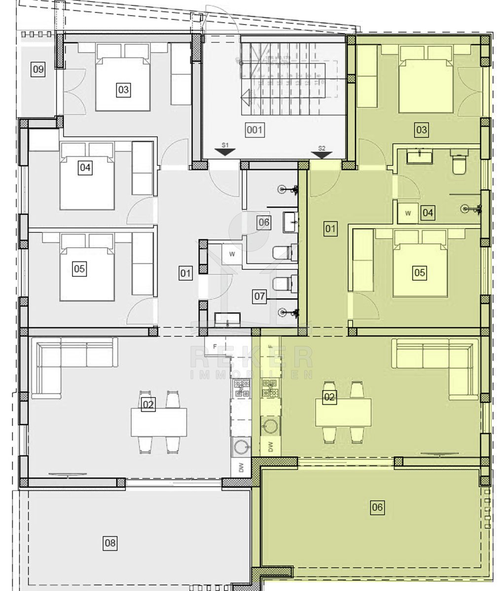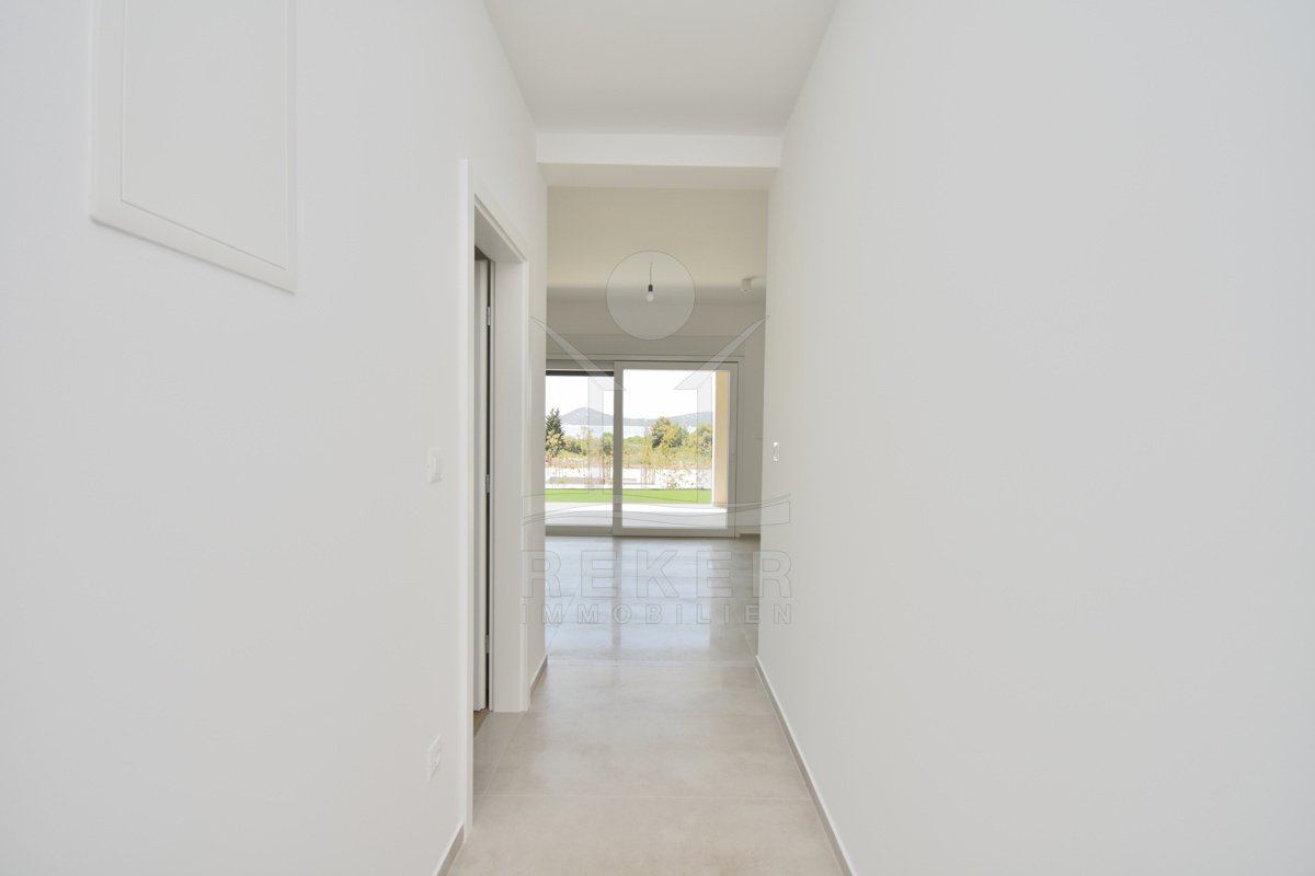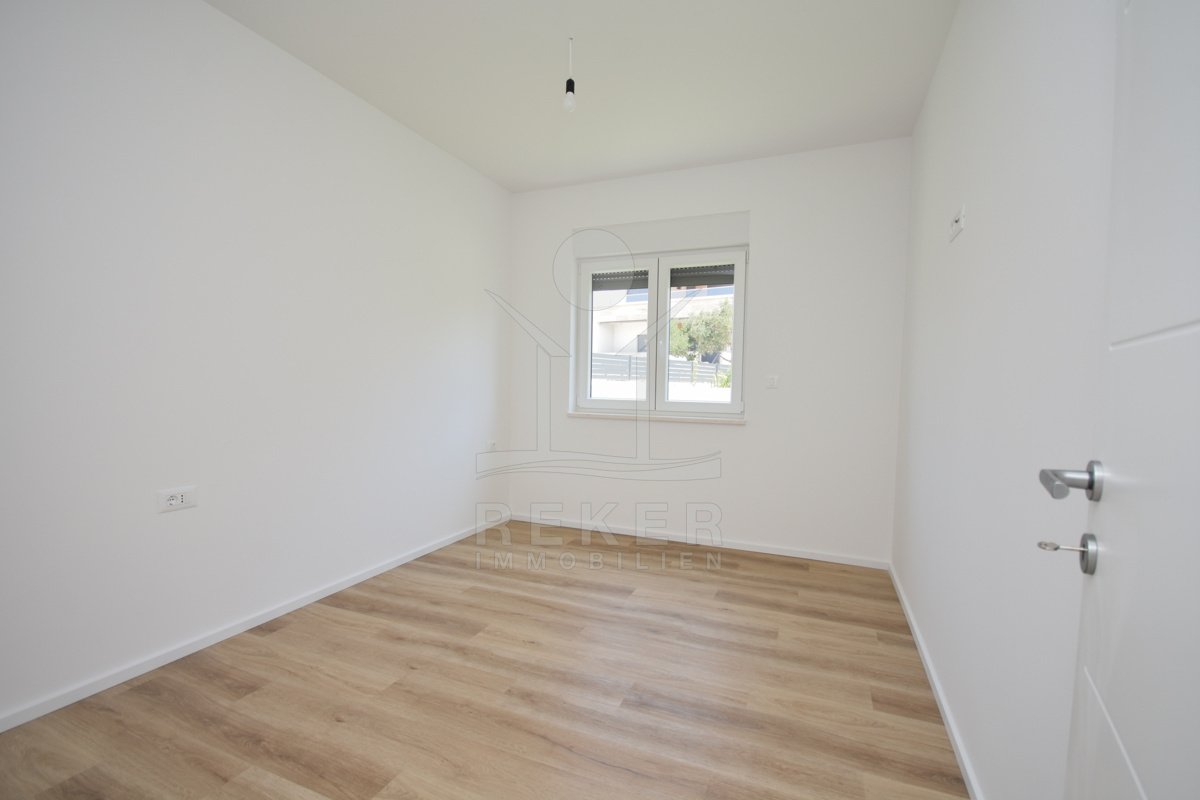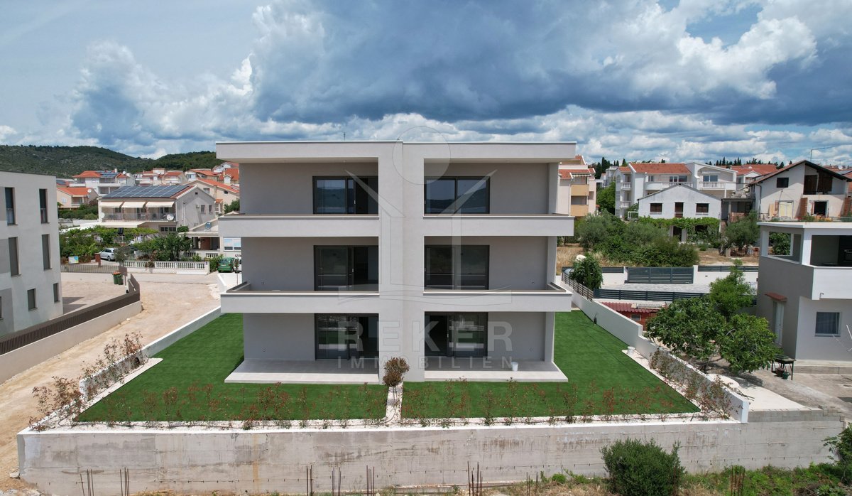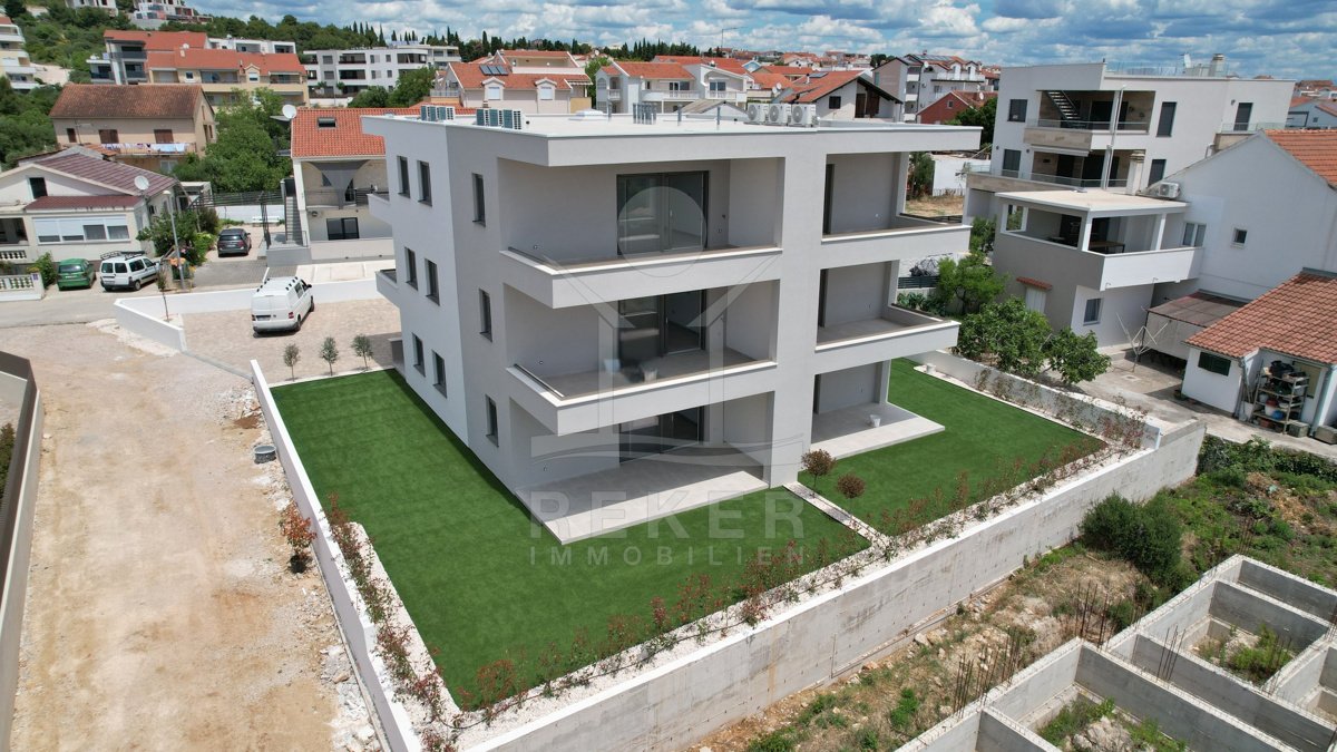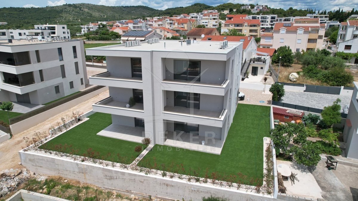 Vodice liegt an der dalmatinischen Küste – beliebt, gewachsen und dennoch ruhig. Genau dort entsteht dieses neue Wohnhaus. Das Meer ist in Sichtweite. Der nächste Strand? Frisch gestaltet und zu Fuß erreichbar. In der Nachbarschaft: neue Wohnhäuser, gepflegte Straßen, viele Einheimische, aber auch Ruhe für Zweitwohnsitz oder Rückzug. Das Gebäude hat drei Etagen und wirkt klar, modern und hochwertig. Sechs Wohnungen teilen sich den Neubau – jede mit großzügigen Außenbereichen. Die Fassade ist gedämmt, die Bauweise folgt modernen Standards. Vor dem Haus: gepflasterte Stellplätze, rundherum gepflegte Grünfläche mit niedriger Begrenzungsmauer. Ruhige Atmosphäre. Solide Privatsphäre.