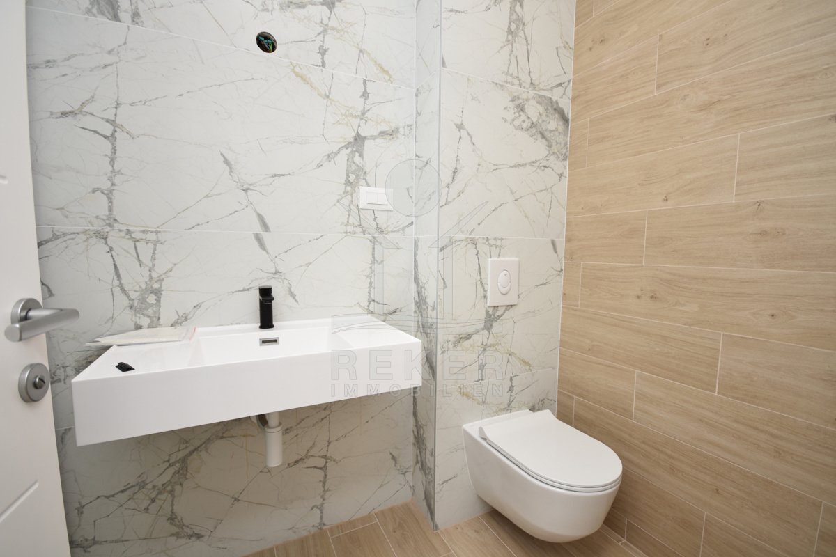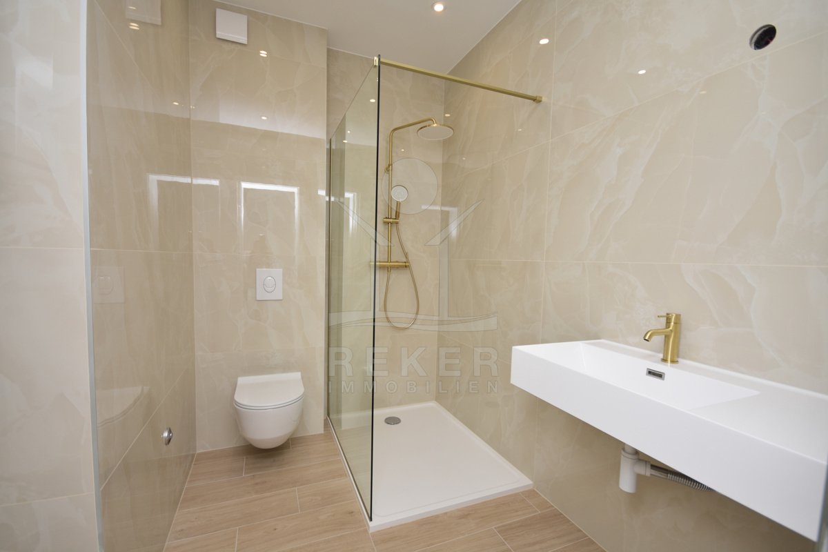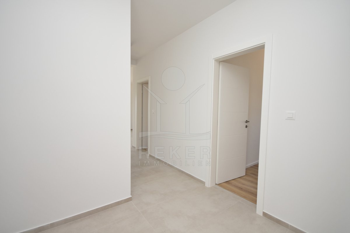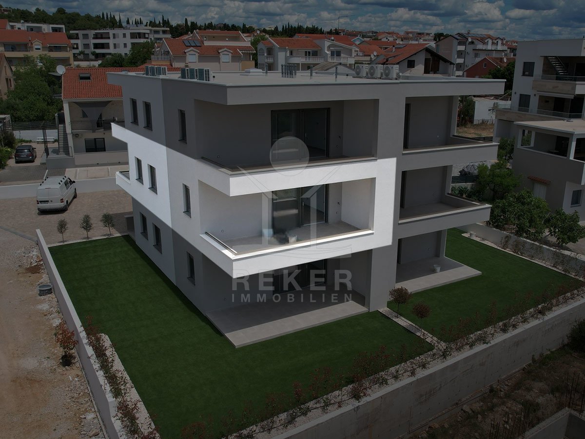 Vodice liegt an der dalmatinischen Küste – beliebt, gewachsen und dennoch ruhig. Genau dort entsteht dieses neue Wohnhaus. Das Meer ist in Sichtweite. Der nächste Strand? Frisch gestaltet und zu Fuß erreichbar. In der Nachbarschaft: neue Wohnhäuser, gepflegte Straßen, viele Einheimische, aber auch Ruhe für Zweitwohnsitz oder Rückzug. Das Gebäude hat drei Etagen und wirkt klar, modern und hochwertig. Sechs Wohnungen teilen sich den Neubau – jede mit großzügigen Außenbereichen. Die Fassade ist gedämmt, die Bauweise folgt modernen Standards. Vor dem Haus: gepflasterte Stellplätze, rundherum gepflegte Grünfläche mit niedriger Begrenzungsmauer. Ruhige Atmosphäre. Solide Privatsphäre.