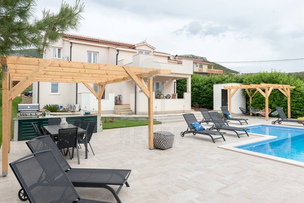 Die Außenbereiche sind ein echtes Highlight: Auf 1.591 m² erwartet Sie ein gepflegter Garten mit alten Olivenbäumen, üppigem Grün und einer dichten Hecke, die das gesamte Grundstück abschirmt. Mittelpunkt ist der 60 m² große Infinity-Pool mit Liegewiese – weitläufig, offen, entspannt. Daneben: eine überdachte Terrasse mit gemütlichem Essbereich, Außentoilette, Dusche und einer voll ausgestatteten Sommerküche mit Grill. Auch das Nebengebäude hat seinen eigenen Gartenbereich samt Pergola, Loungebereich und separater Einfahrt.