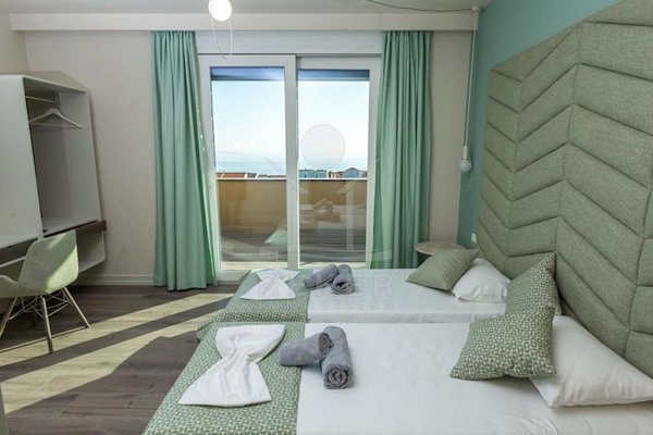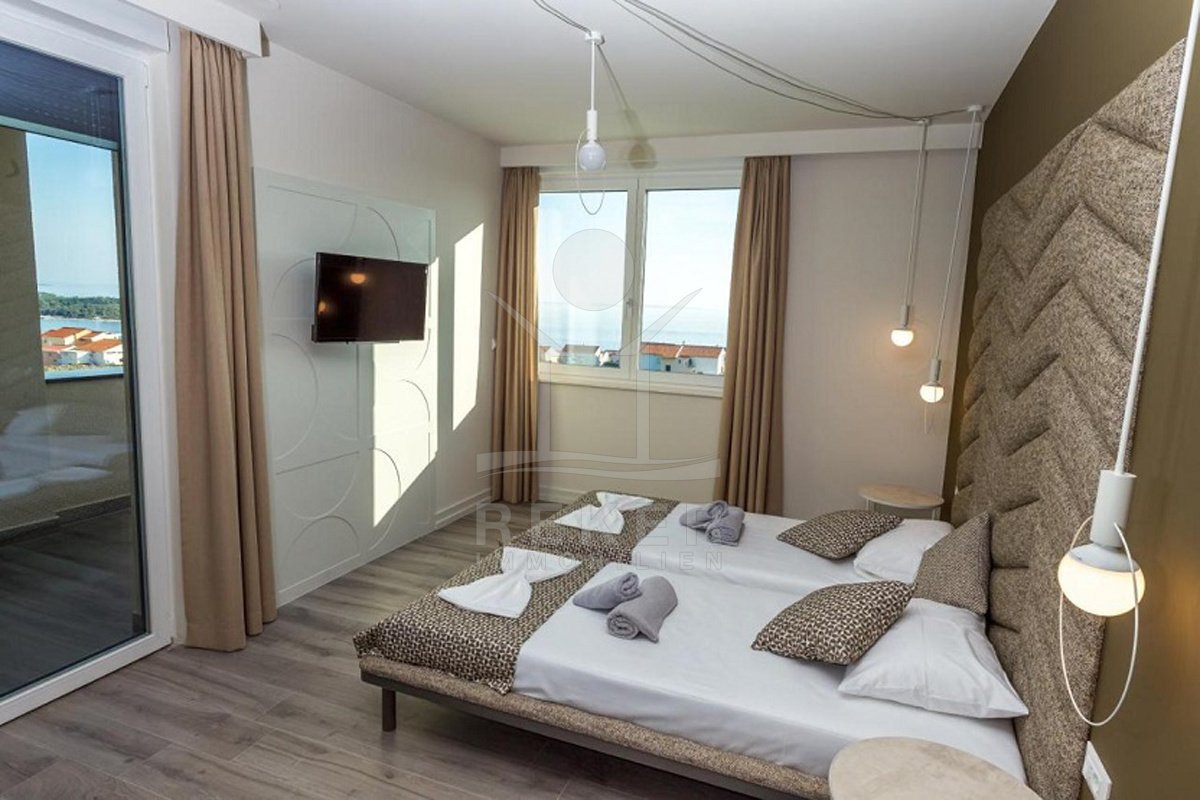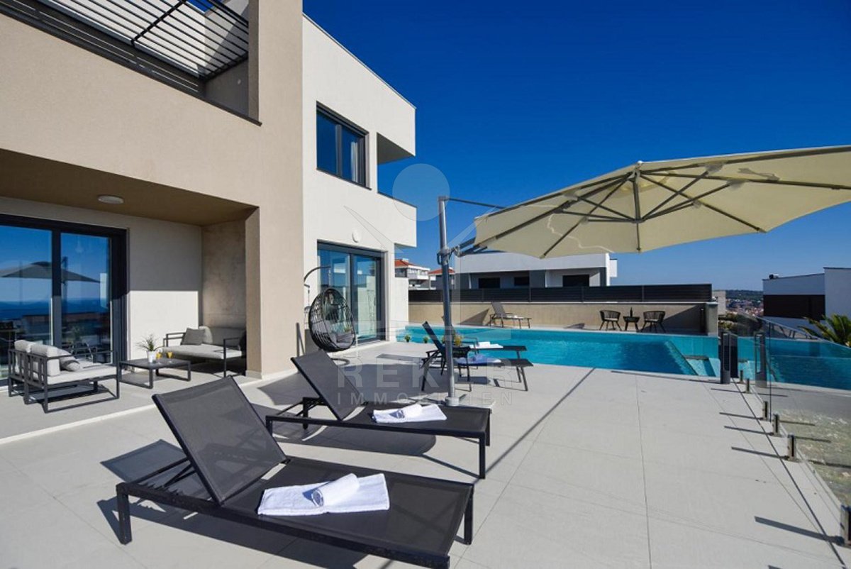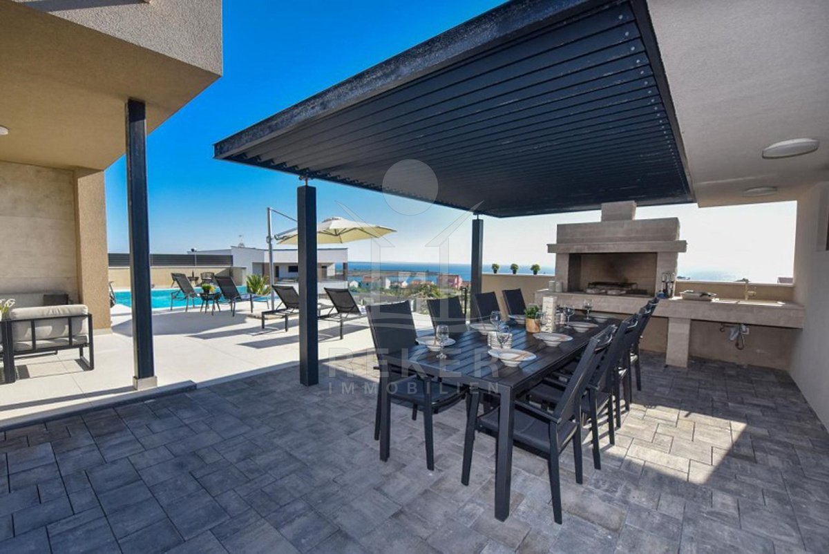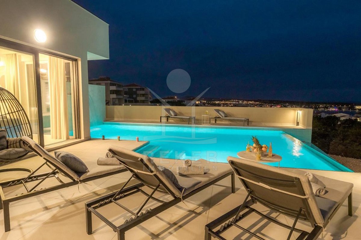 Novalja. Südhang. Die Sonne über dem Meer – direkt vor Ihrer Terrasse. Diese moderne Villa liegt in erhöhter Lage auf der Insel Pag, mit Panoramablick über die Dächer von Novalja und das offene Wasser. Sie erreichen das Meer in etwa 600 Metern oder 15 Minuten zu Fuß. Die Straße ist ruhig, der Blick frei. Vor dem Haus: Stellplätze für mehrere Autos.