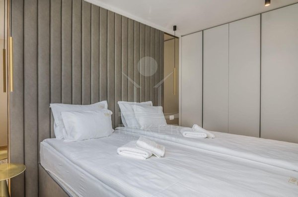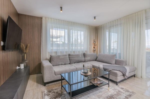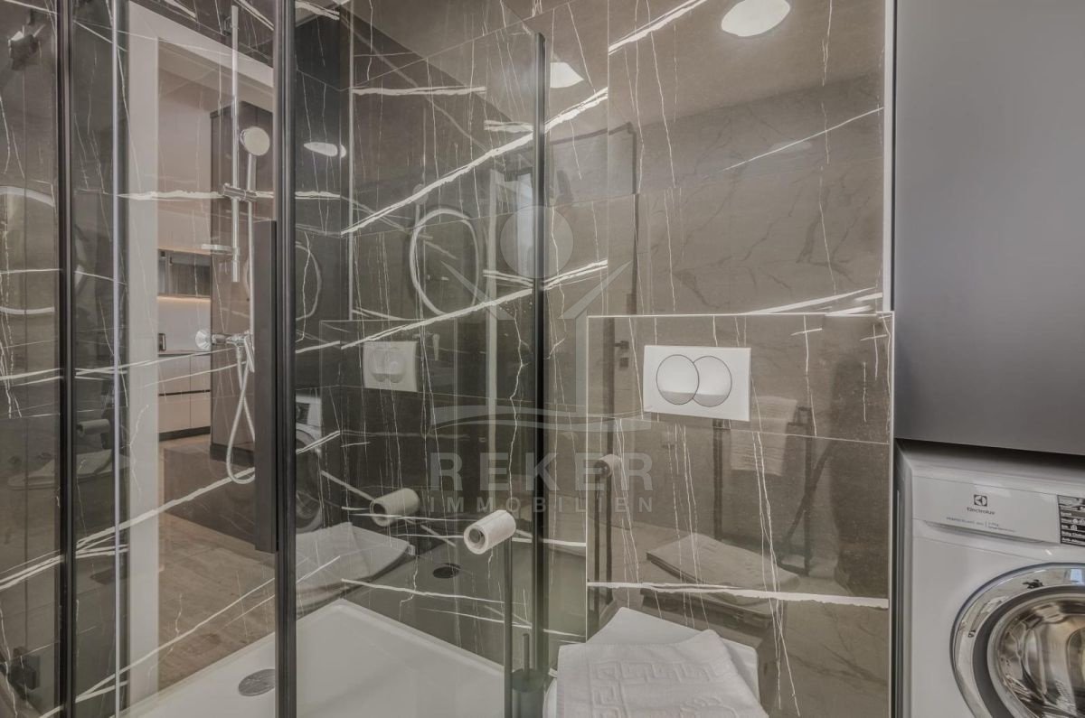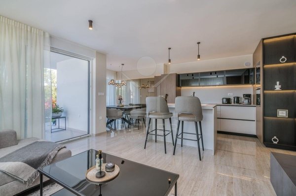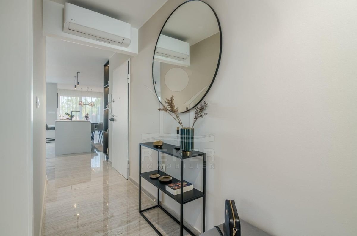 Diese Wohnung vereint Design, Lage und Privatsphäre: Ein neuwertiger Bau mit überdachter Terrasse, 240 m² mediterranem Garten und eigenem Pool. Nur drei Gehminuten trennen Sie vom Strand – der perfekte Ort für entspannte Auszeiten am Meer.