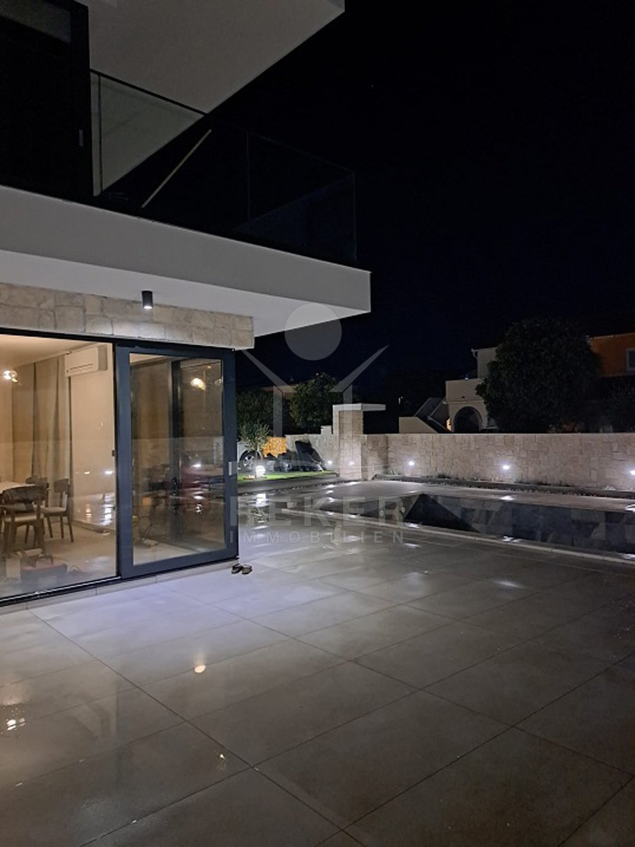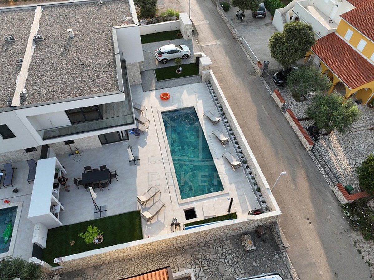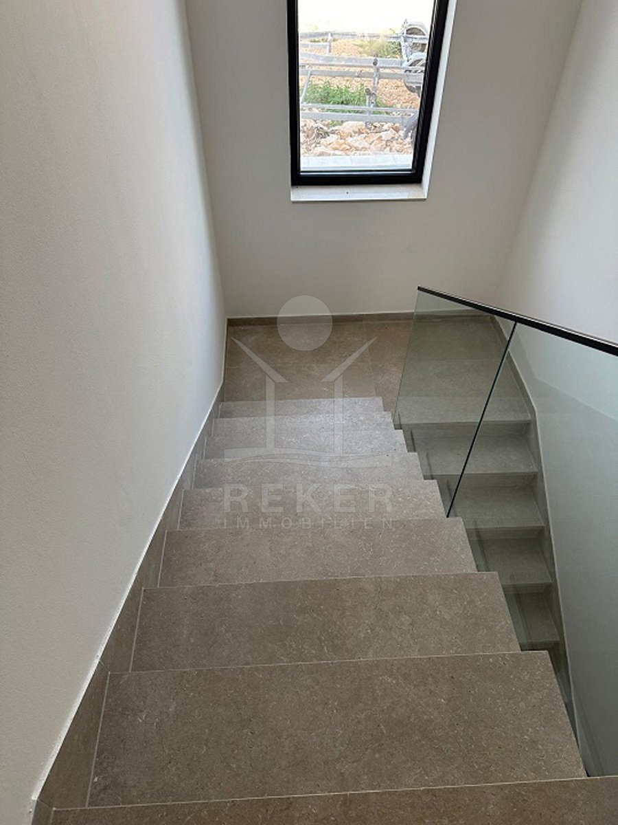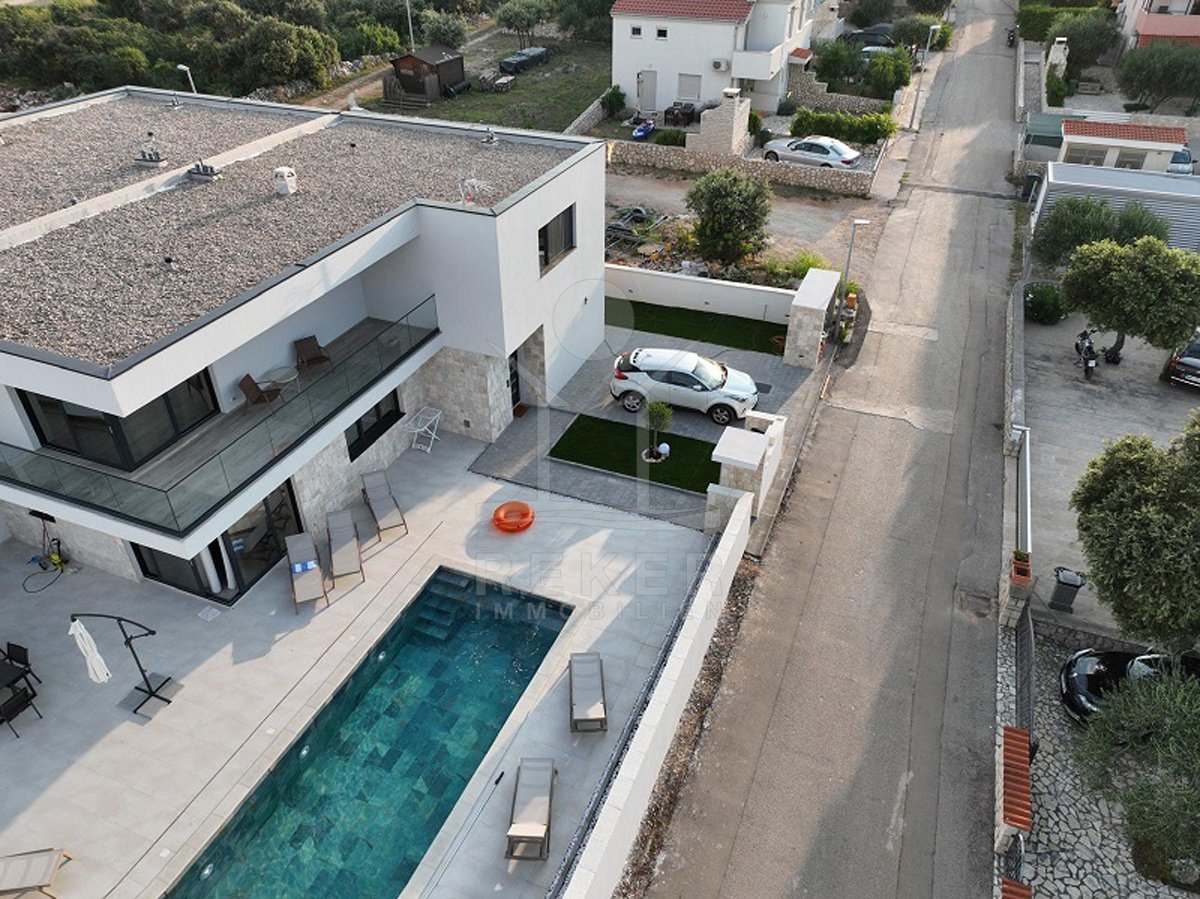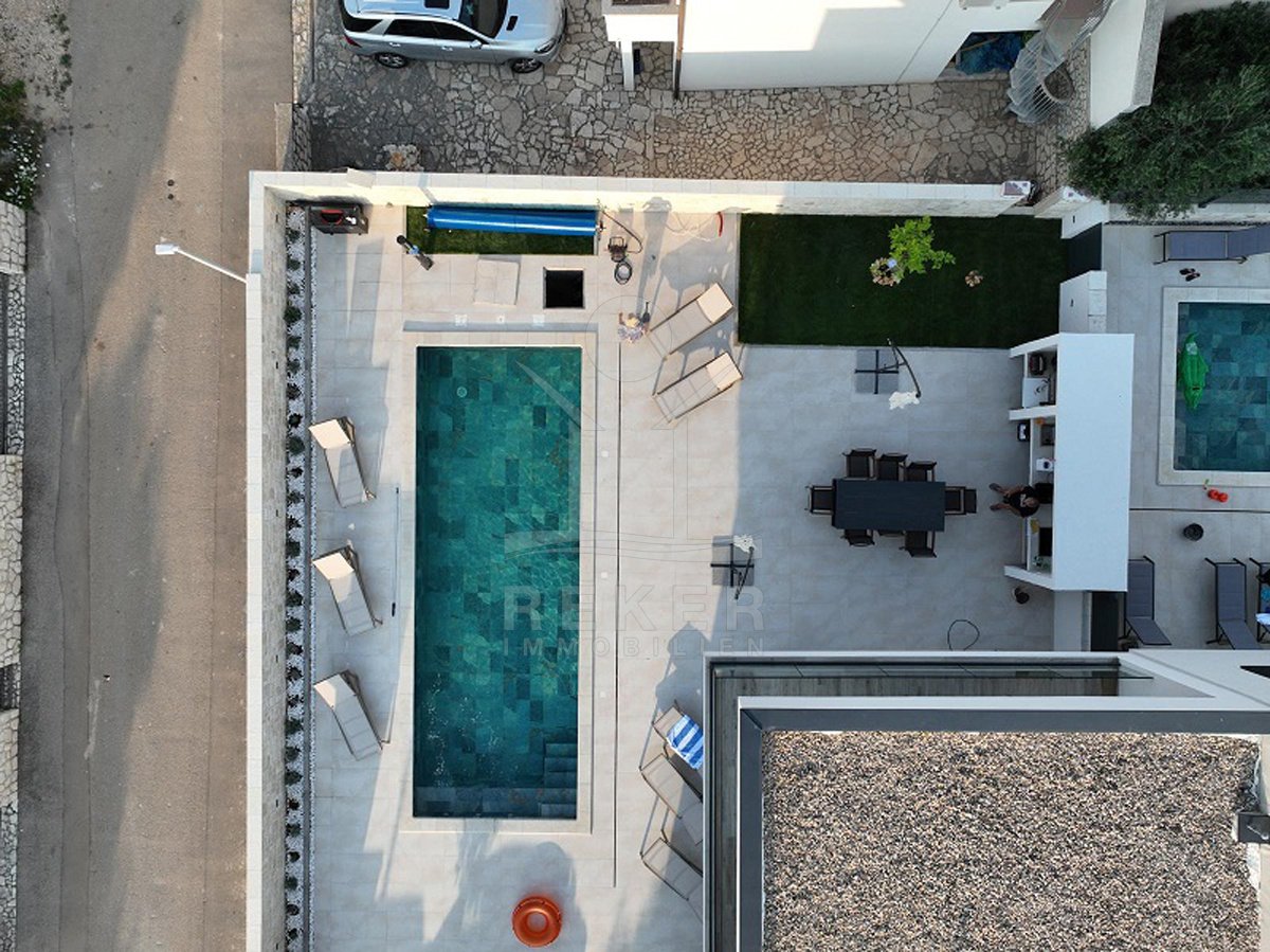 Ruhige Seitenstraße, gepflegte Nachbarschaft, nur rund 300 Meter bis zur Küste – in dieser begehrten Wohnlage von Mandre auf der Insel Pag erwartet Sie eine moderne Stadtvilla mit Komfort auf zwei Ebenen. Das Haus steht auf einem 465 m² großen