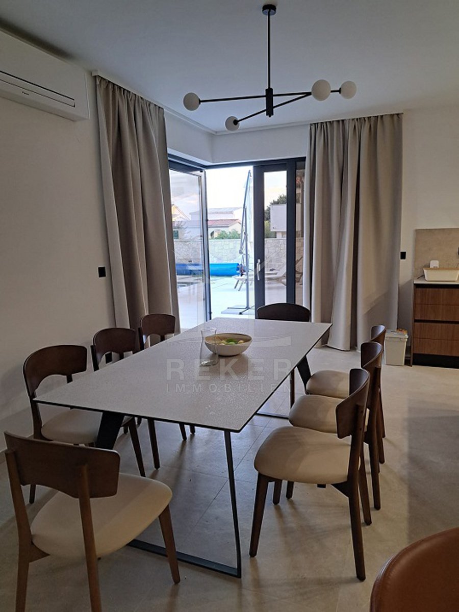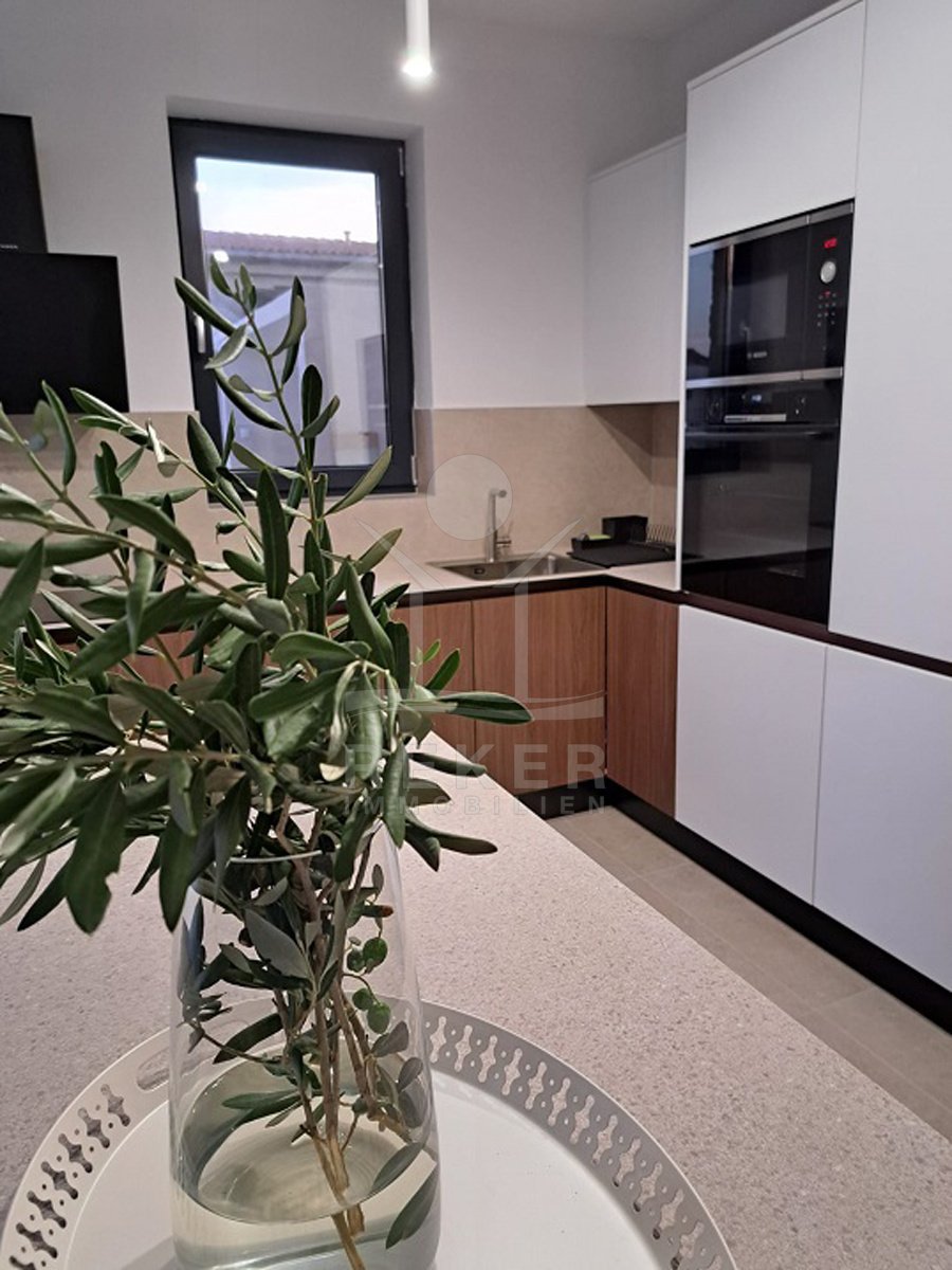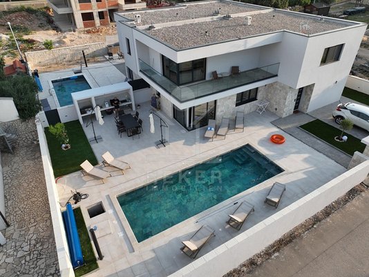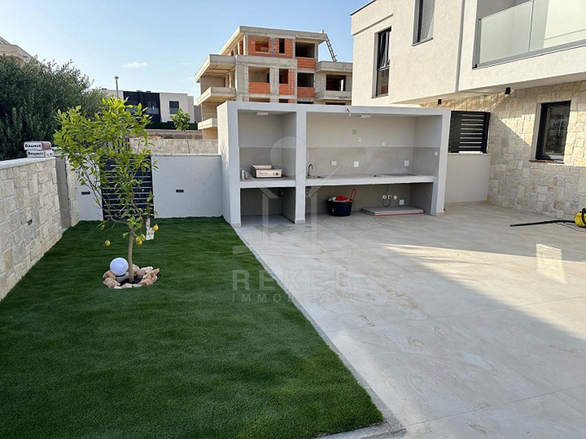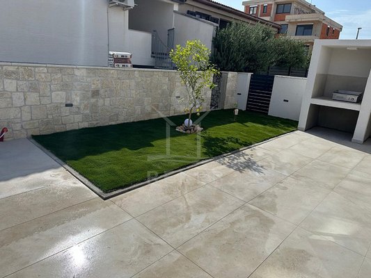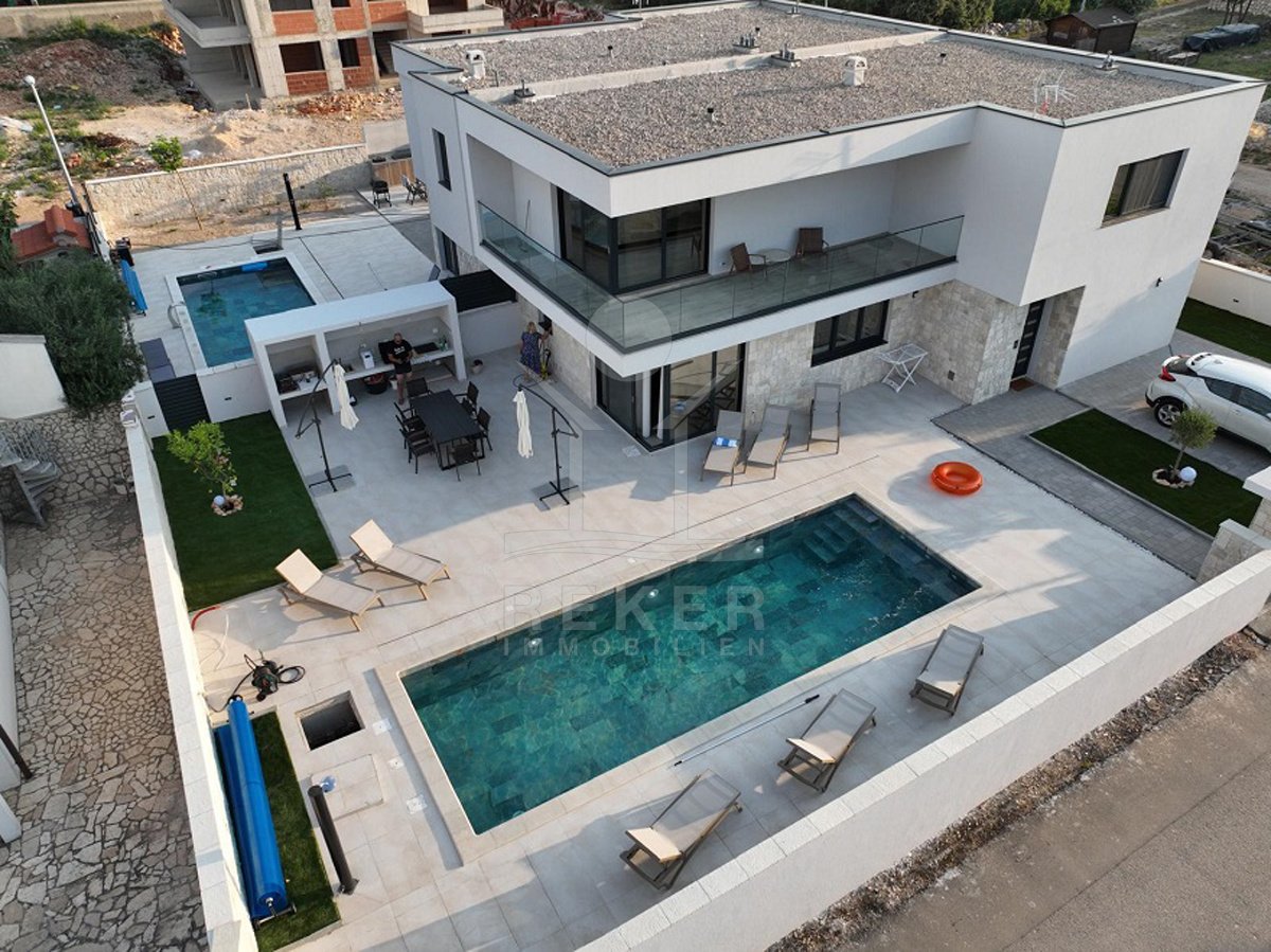 Ruhige Seitenstraße, gepflegte Nachbarschaft, nur rund 300 Meter bis zur Küste – in dieser begehrten Wohnlage von Mandre auf der Insel Pag erwartet Sie eine moderne Stadtvilla mit Komfort auf zwei Ebenen. Das Haus steht auf einem 465 m² großen