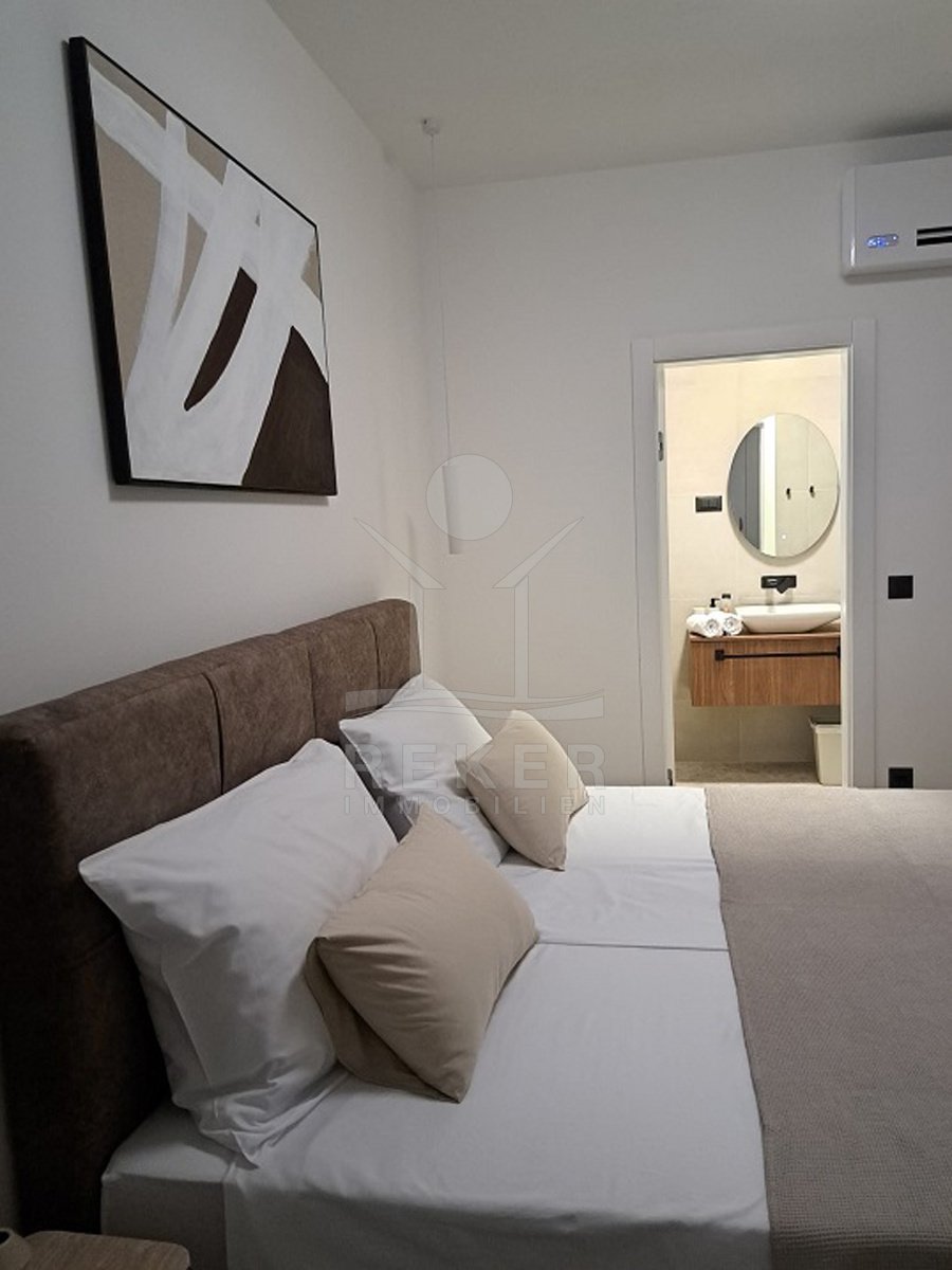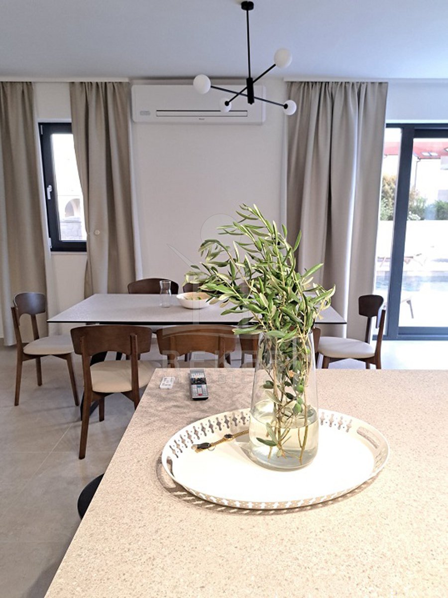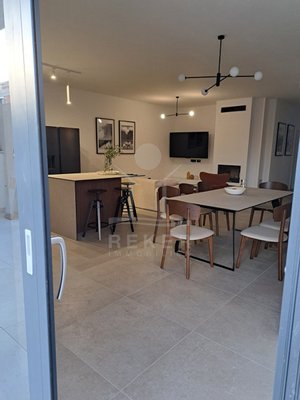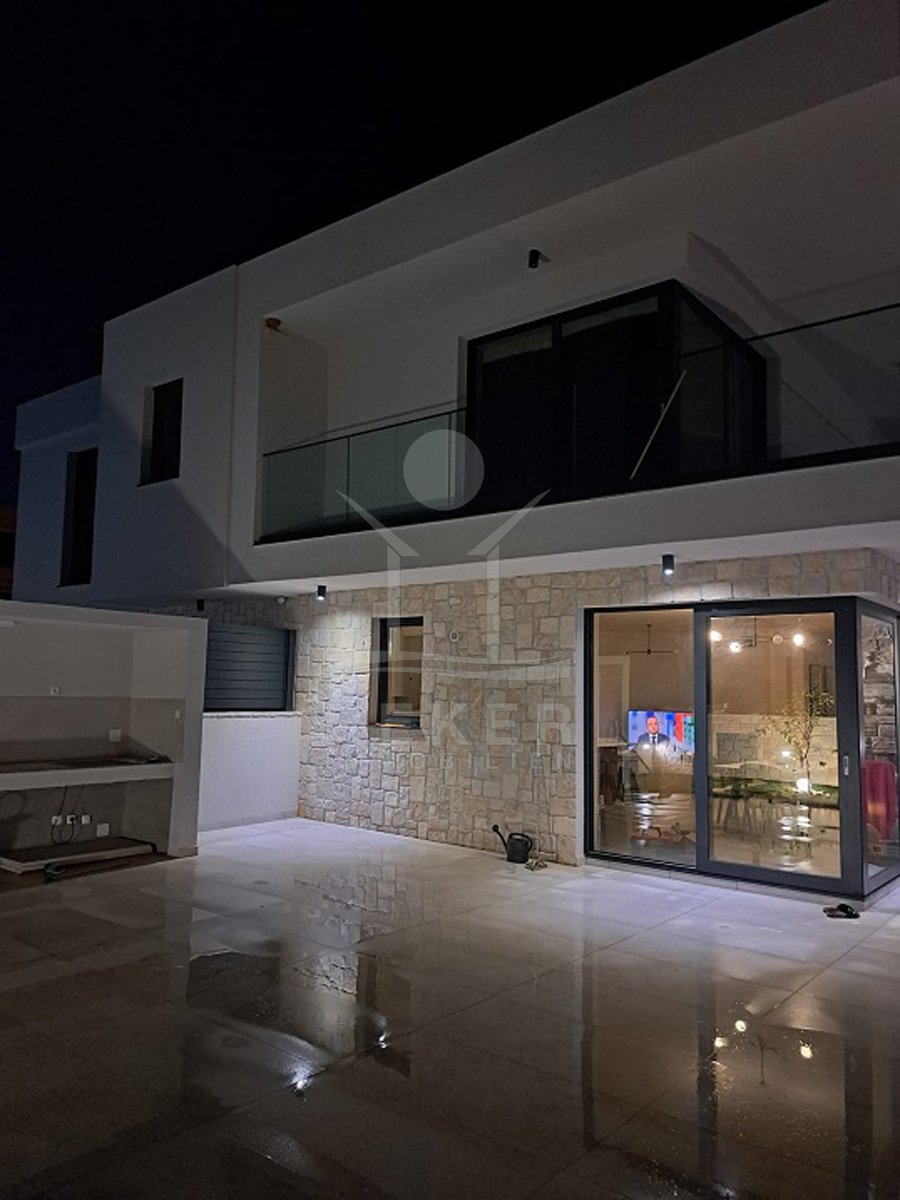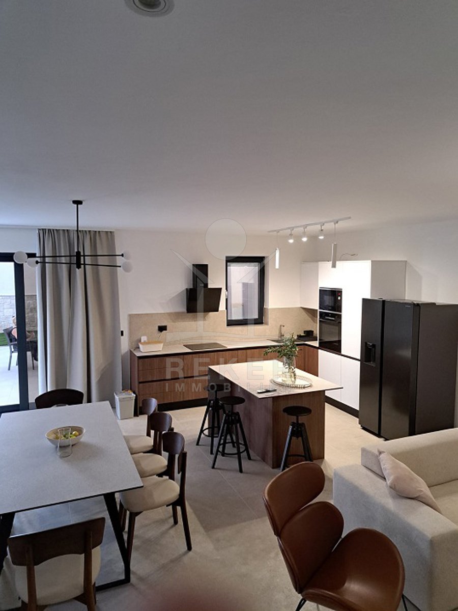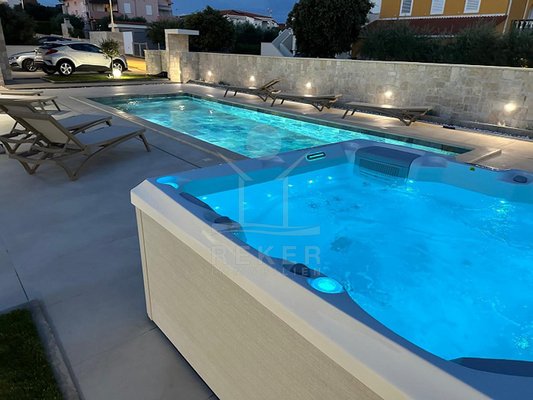 Ruhige Seitenstraße, gepflegte Nachbarschaft, nur rund 300 Meter bis zur Küste – in dieser begehrten Wohnlage von Mandre auf der Insel Pag erwartet Sie eine moderne Stadtvilla mit Komfort auf zwei Ebenen. Das Haus steht auf einem 465 m² großen