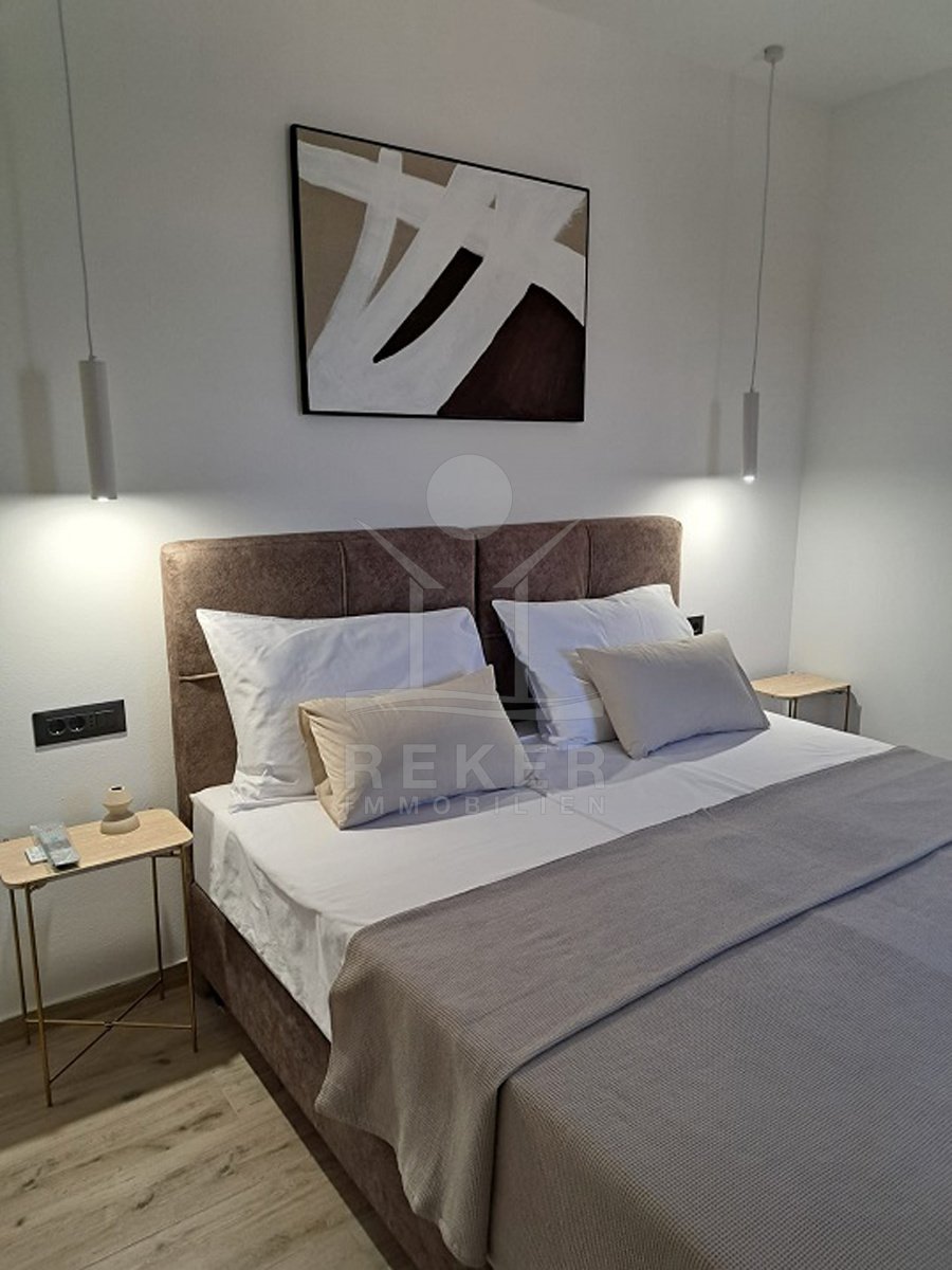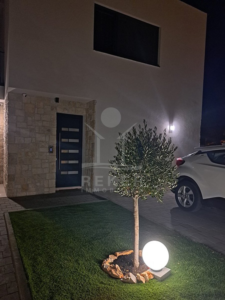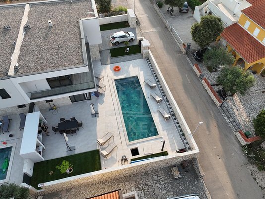 Ruhige Seitenstraße, gepflegte Nachbarschaft, nur rund 300 Meter bis zur Küste – in dieser begehrten Wohnlage von Mandre auf der Insel Pag erwartet Sie eine moderne Stadtvilla mit Komfort auf zwei Ebenen. Das Haus steht auf einem 465 m² großen Grundstück und bietet zwei private Stellplätze direkt auf dem Grundstück, inklusive Autoladegerät. Der Zugang erfolgt über ein elektrisches Einfahrtstor, eingefasst von einer Natursteinmauer. Die Umgebung ist hochwertig bebaut, angenehm ruhig und liegt an der sonnigen Südküste der Insel. Der Meerblick beginnt praktisch am Ende der Straße.