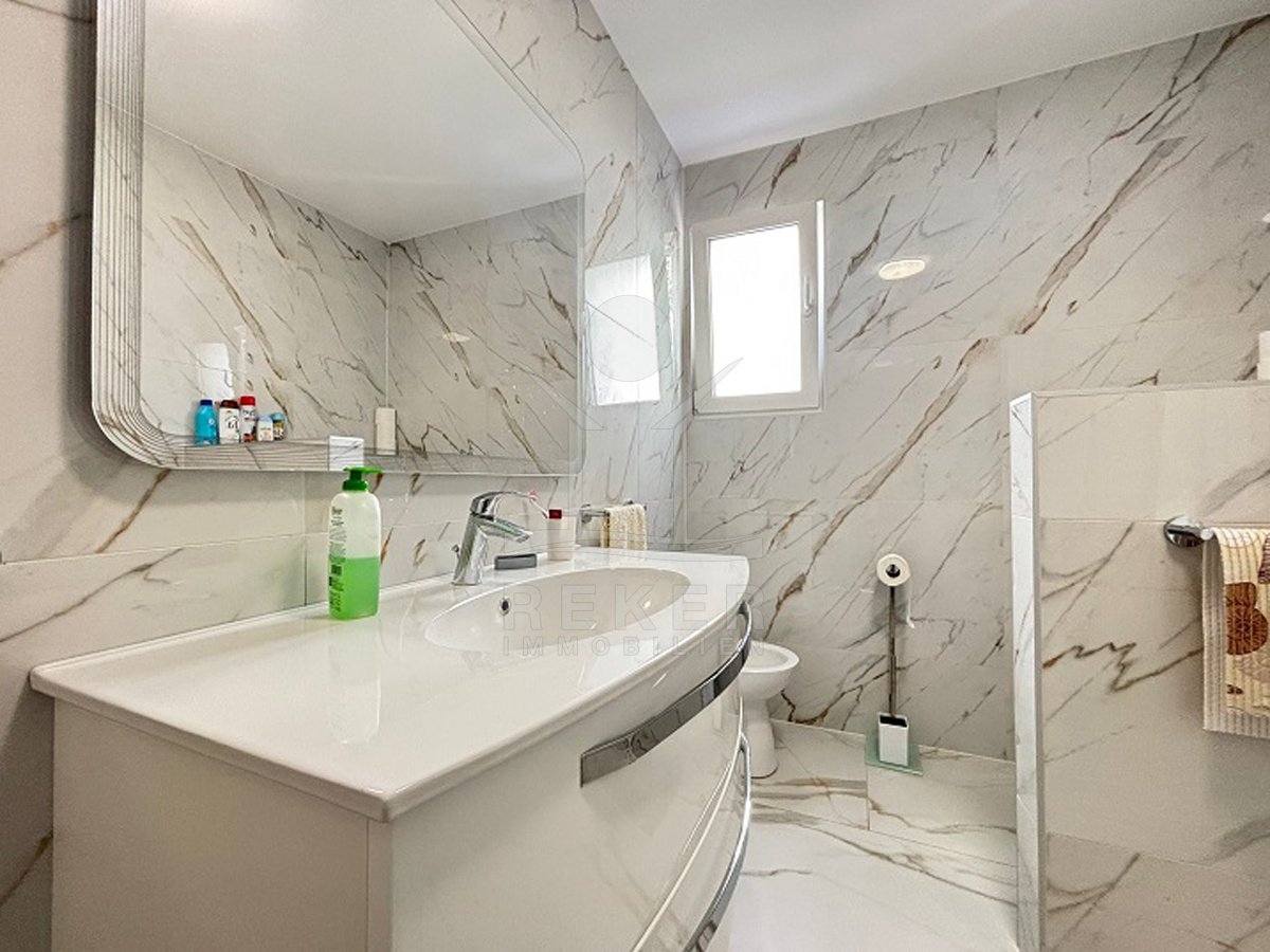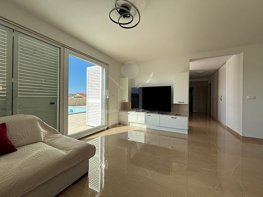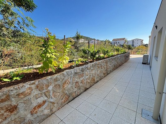 Die Terrasse ist das Herzstück: Weitläufig, gefliest und komplett zum Meer hin geöffnet. Hier spielt sich das Leben draußen ab – auf Wunsch im Schatten, auf der Liege oder direkt am Wasser. Der beheizte Pool misst 10 × 5 Meter, hat 1,5 Meter Tiefe und ist ein echtes Highlight: LED-Beleuchtung in 25 Farben, Wärmepumpe und viel Platz zum Schwimmen. Wer gerne gärtnert, wird sich über das gemauerte Hochbeet entlang der Rückseite freuen – bewässert mit Regenwasser aus der unterirdischen Zisterne.