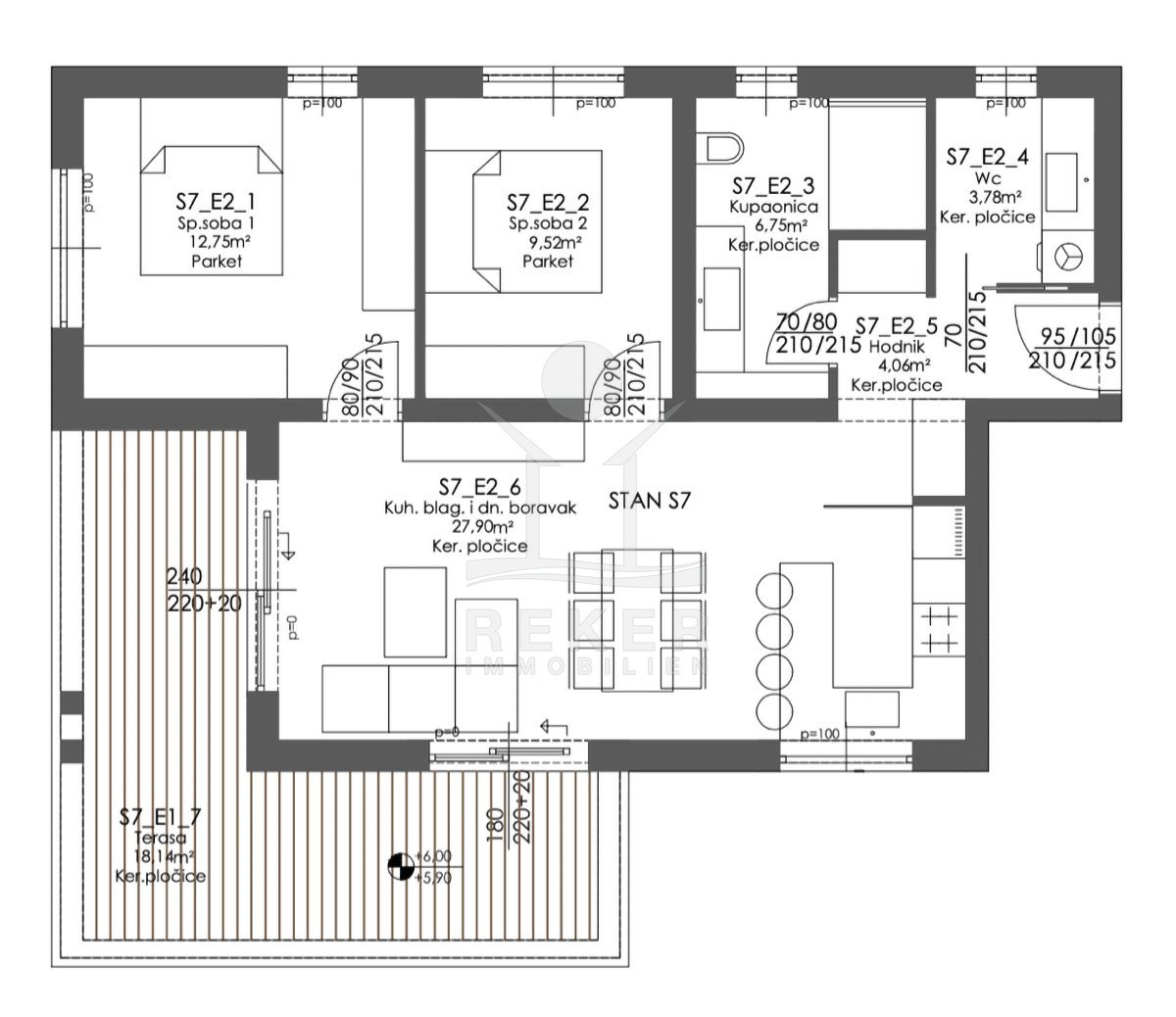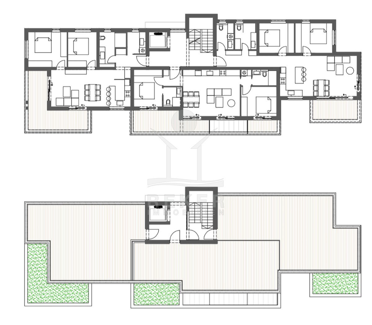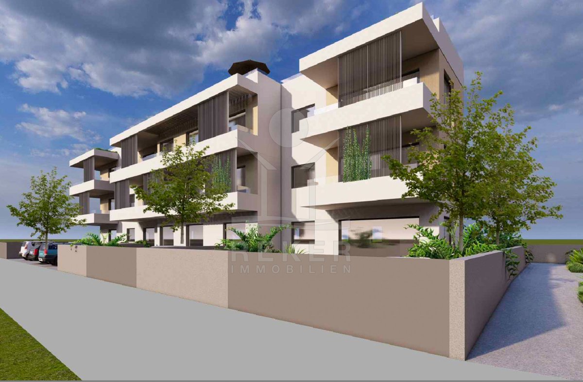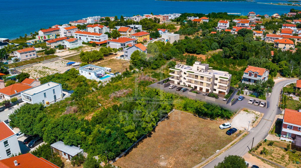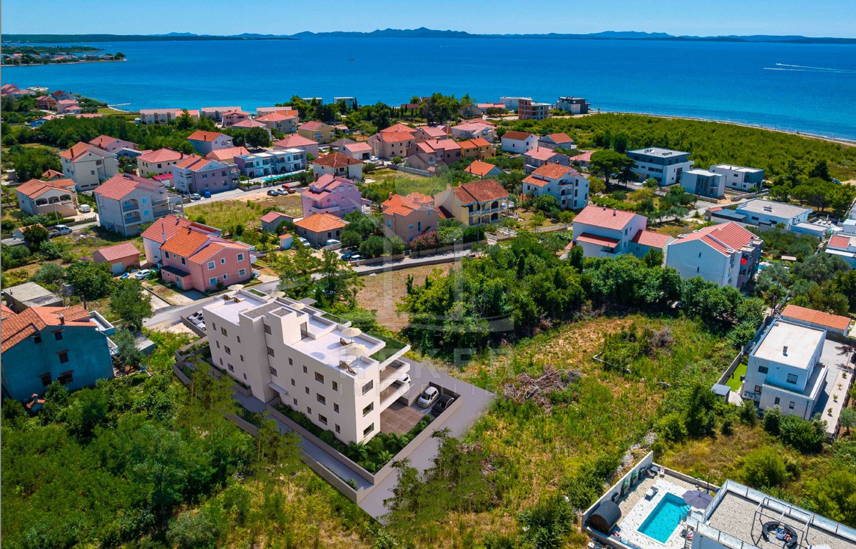 Nur wenige Schritte vom Meer entfernt – hier wohnen Sie im zweiten Obergeschoss eines modernen, dreistöckigen Wohnhauses mit insgesamt neun Einheiten. Das Gebäude steht am Ende einer ruhigen Zufahrtsstraße in einem gepflegten Wohnviertel von Privlaka. Von der Straße sind es etwa 200 Meter bis zum flachen Strand mit Badeplateaus, schattigen Liegeflächen und türkisblauem Wasser. Zwei eigene Außenstellplätze sorgen für bequeme Ankunft, auch in der Hochsaison. Ein Aufzug bringt Sie direkt in die Penthouse-Etage.