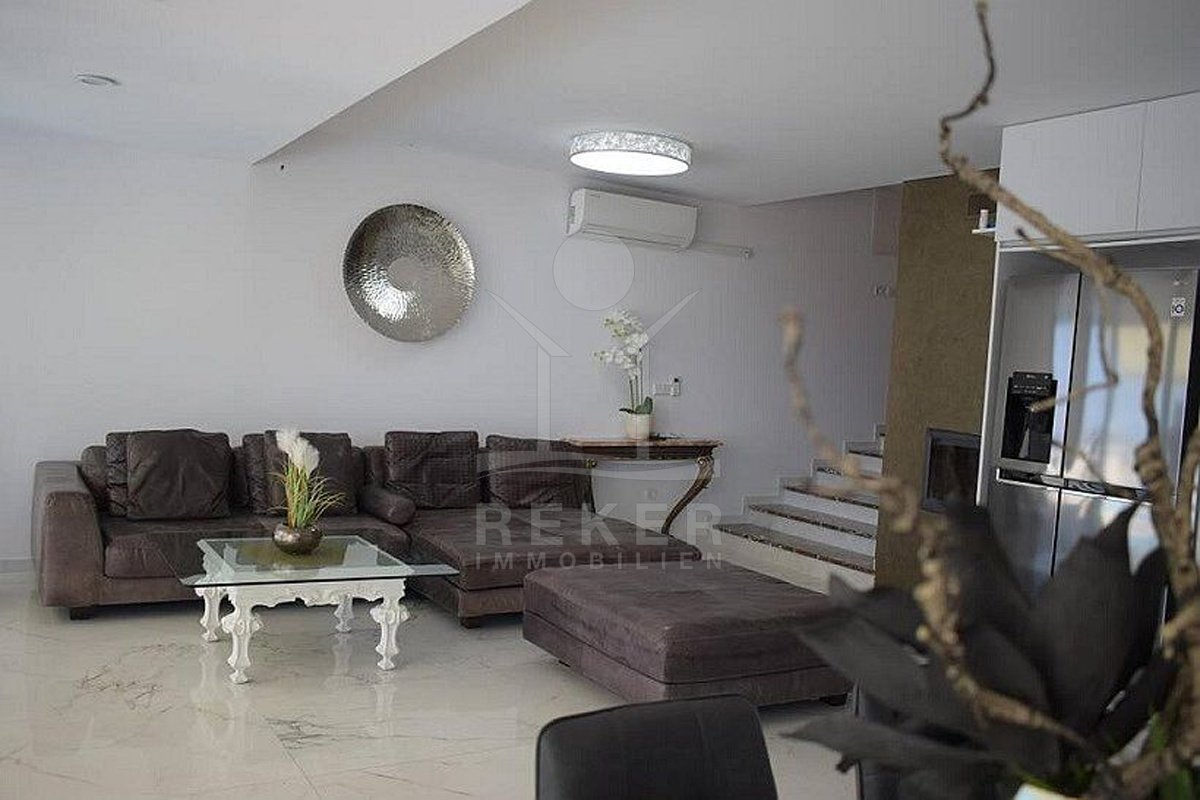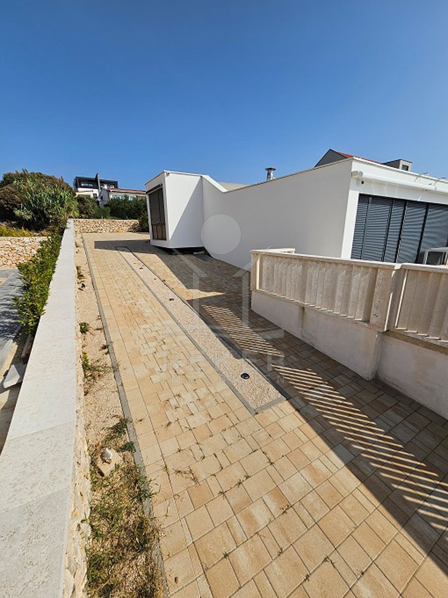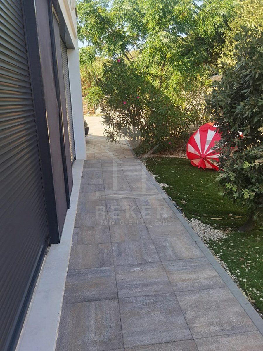 Oben in den Hügeln von Mandre, ruhig gelegen und mit Weitblick aufs offene Meer: Diese ebenerdige Villa bietet genau das, was viele suchen – Ruhe, Aussicht, Privatsphäre. Das Grundstück ist vollständig eingefriedet und über eine gepflasterte Zufahrt erreichbar. Die Umgebung ist gepflegt und von modernen Häusern geprägt. Bis zum Meer sind es gerade einmal 400 Meter. Wer gern zu Fuß geht, erreicht den Strand in etwa zehn Minuten. Der großzügige Vorplatz bietet mehrere Stellplätze direkt auf dem Grundstück.