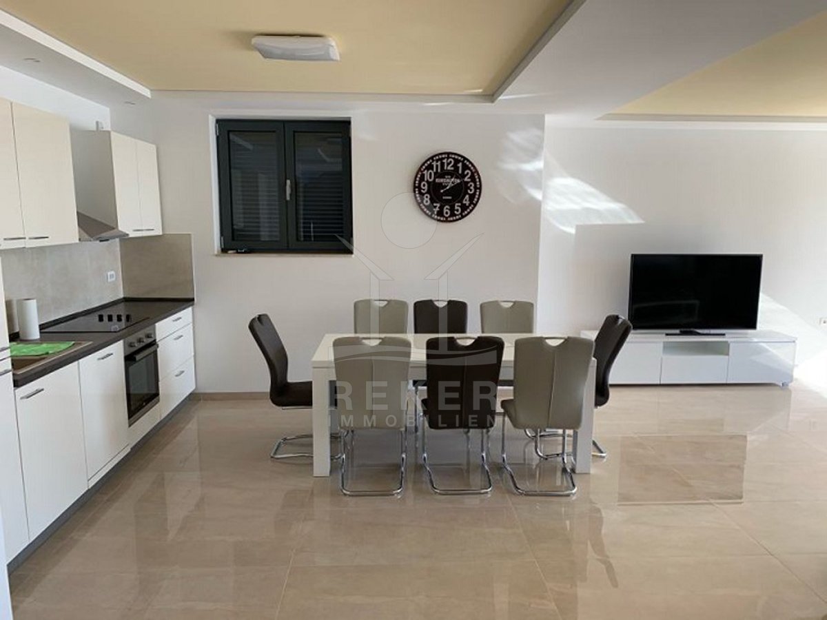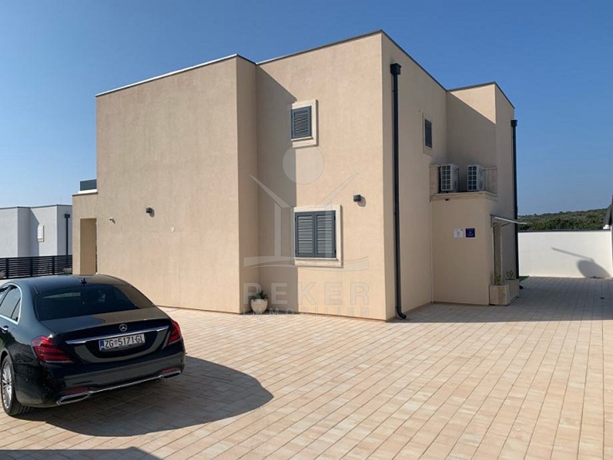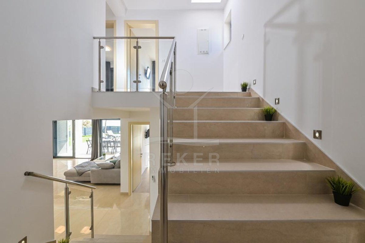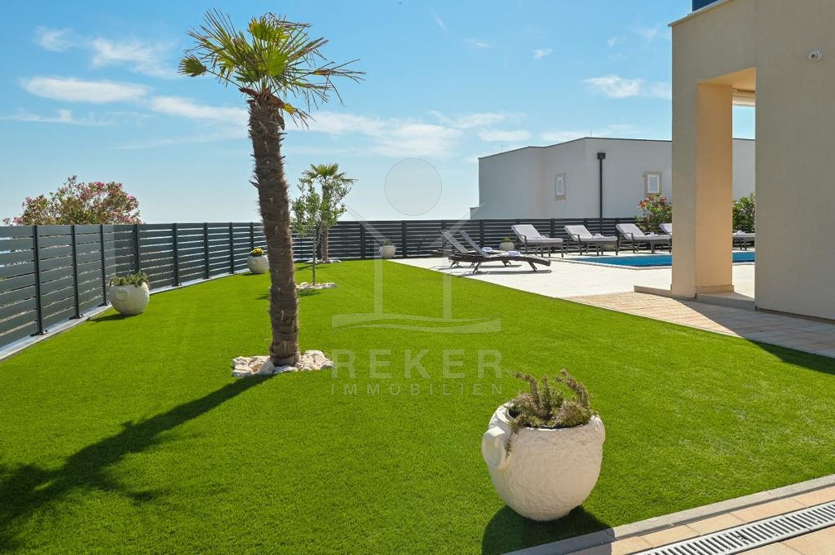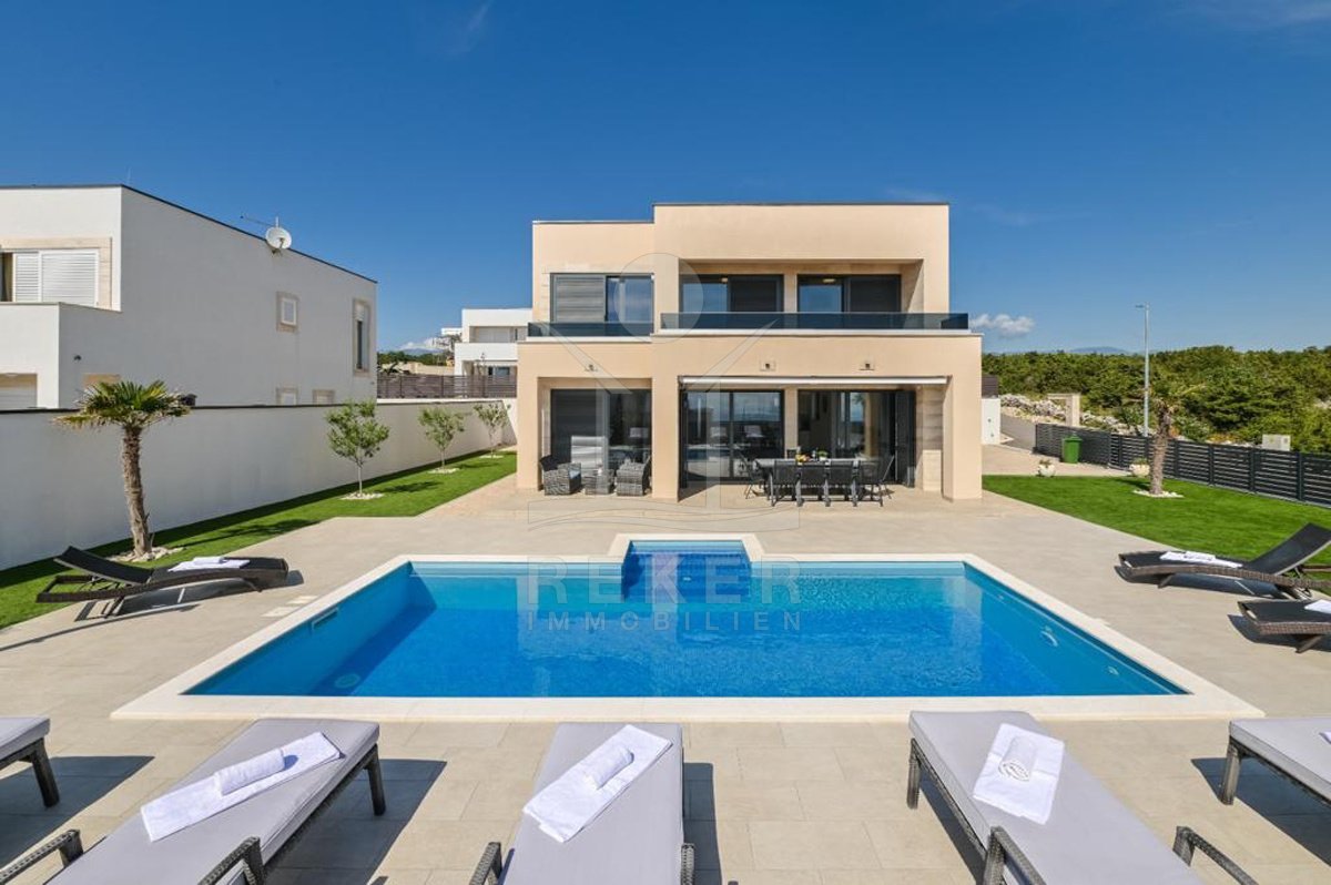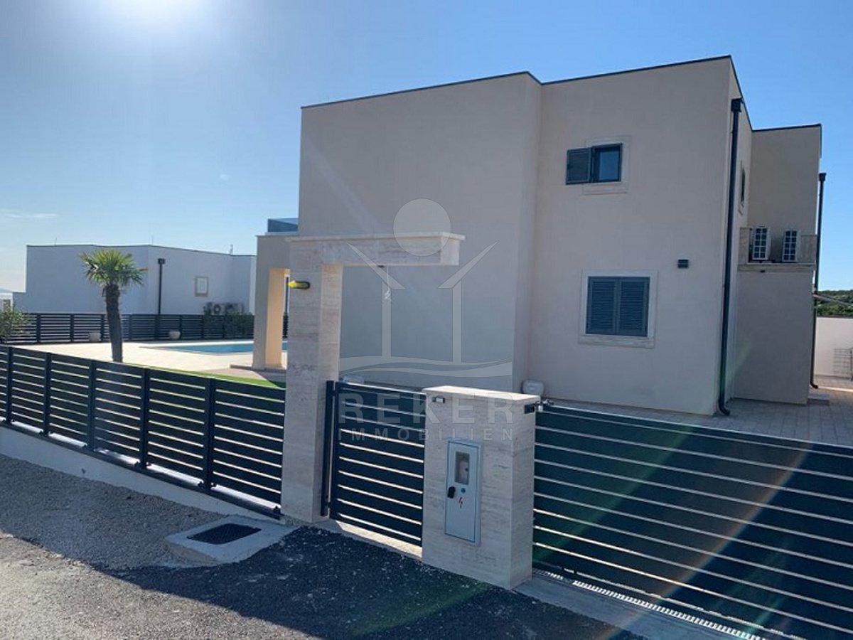 In der Nähe von Novalja, auf der Insel Pag, wartet diese moderne Villa auf Sie – in einer ruhigen und grünen Wohnlage. Die Straße ist asphaltiert, das Grundstück komplett eingefriedet, das elektrische Einfahrtstor öffnet sich zur privaten Zufahrt.