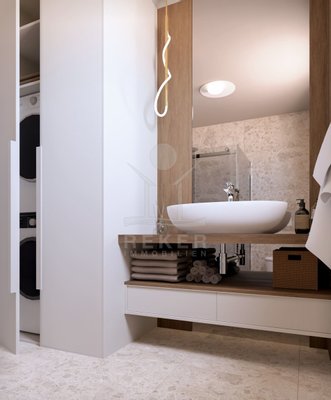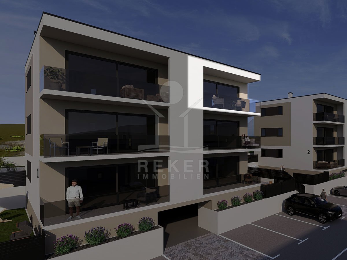 In einem der schönsten Viertel von Novi Vinodolski entsteht der Wohnkomplex. Ruhig gelegen, etwas erhöht über dem Ort, mit viel Grün drumherum. Der Blick auf das Meer und die umliegenden Inseln – großartig. Gleichzeitig sind Supermärkte, Cafés, Restaurants und Erholungsflächen ganz nah. Das historische Stadtzentrum ist in wenigen Minuten erreicht. Die fünf Gebäude fügen sich gut in die Umgebung ein. Jeweils vier Stockwerke: unten der Keller mit Lagerräumen, darüber drei Etagen mit je zwei Wohnungen. Alles hochwertig gebaut, mit solider Betonkonstruktion, wärmegedämmt, erdbebensicher. Rund ums Haus: gepflegte Wege, markierte Parkplätze, Grünflächen mit Zäunen, stimmungsvolle Beleuchtung.