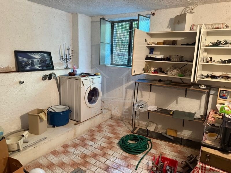 Der Garten macht Eindruck. Mediterrane Pflanzen, alte Bäume und eine natürliche Umgebung sorgen für Schatten und Privatsphäre. Es gibt mehrere Zuwege, eine großzügige, nicht überdachte Terrasse im Erdgeschoss und einen gemauerten Grill. Der Eingangsbereich ist mit Beleuchtungselementen ausgestattet. Trotz der Größe wirkt das Grundstück übersichtlich. Die vorhandene Bepflanzung lässt sich leicht pflegen oder nach Wunsch gestalten.