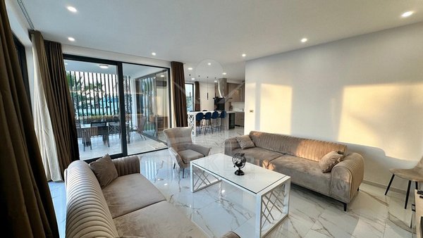 Direkt vor dem Wohnbereich öffnet sich die Terrasse zur Poollandschaft. Rundherum: Palmen, mediterrane Pflanzen, viel Ruhe. Der Pool misst 25 m² und wird flankiert von mehreren Liegeflächen und einer Esstisch-Gruppe im Freien. Die Anlage ist eingewachsen, ein stilvoller Sichtschutz ist vorhanden. Ideal für entspannte Abende mit Familie oder Gästen.