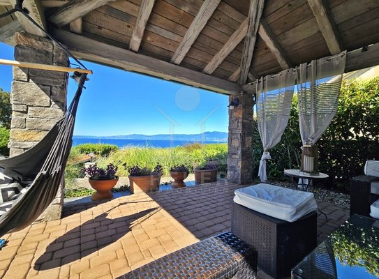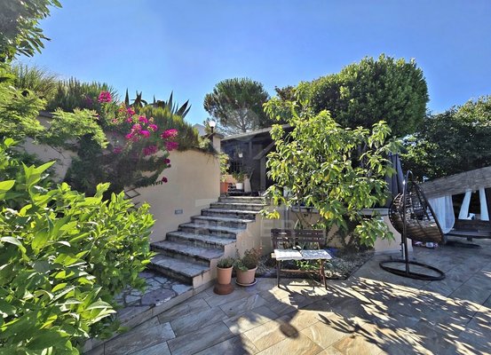 Der Garten ist ein echtes Highlight: Kaskadenförmig angelegt, mediterran bepflanzt, komplett mit Bewässerungssystem. In der Mitte liegt der 4 x 8 Meter große Pool – perfekt platziert, mit freiem Blick aufs Wasser. Gleich daneben eine charmante Sommerküche im massiven Natursteinpavillon. Dort verbringen Sie Ihre Abende. Entspannt, schattig, mit Grill und Esstisch. Und alles gut durchdacht: Von der Natursteintreppe bis zur kleinen Bank im Schatten des Feigenbaums. Das gesamte Grundstück ist alarmgesichert und gepflegt bis ins Detail.