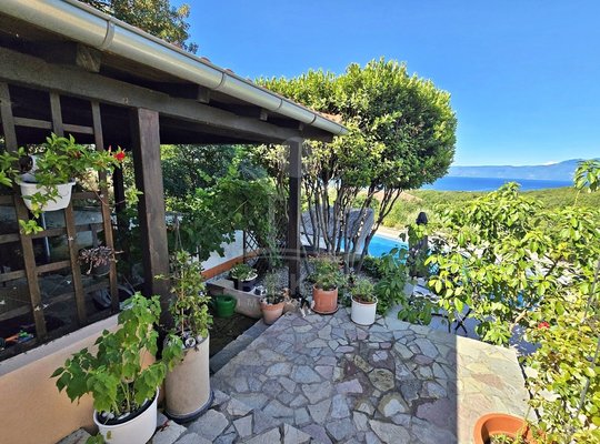 Am Ortsrand von Kostrena, eingebettet in eine grüne Hügellandschaft, wartet dieses freistehende Einfamilienhaus auf neue Eigentümer. Die Lage? Herrlich ruhig, waldnah, mit ganz viel Privatsphäre. Und der Blick: Weit über das blaue Meer, unverbaubar