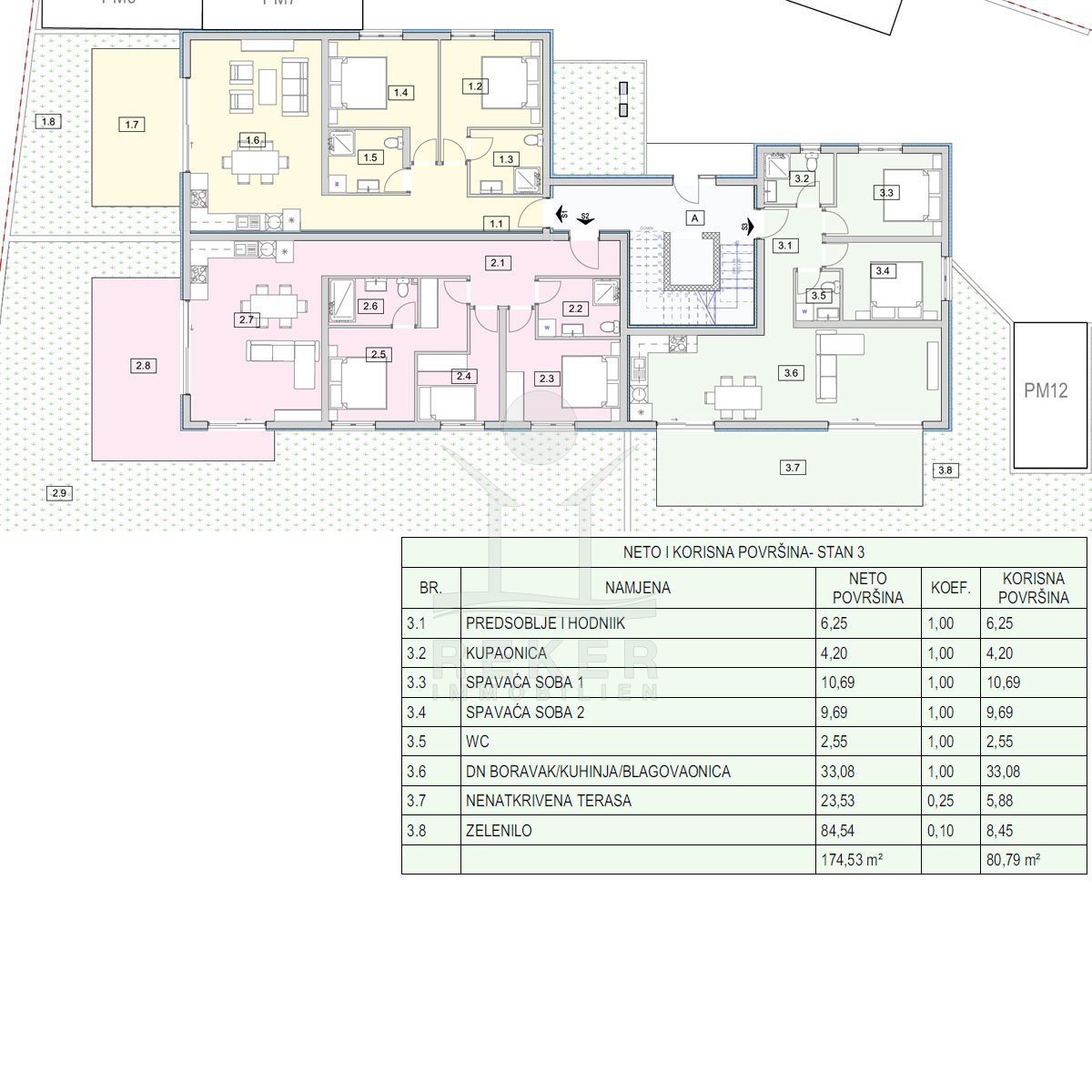 Das Gebäude hat acht Wohnungen, verteilt auf drei Etagen und ein Flachdach. Im Erdgeschoss gibt’s Gärten, ab dem ersten Stock freie Sicht aufs Meer. Modernes Design, klare Linien, helle Fassade. Die oberen Wohnungen mit Balkon, ganz oben sogar mit großer Dachterrasse. Jeder Wohneinheit ist ein Parkplatz zugeordnet. Fertigstellung ist für Herbst 2026 geplant.