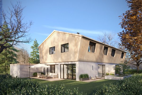 In der Gemeinde Waakirchen, am Ortsrand von Hauserdörfl, entstehen zwei modern gestaltete Doppelhaushälften in nachhaltiger und zeitgemäßer Holzrahmenbauweise.