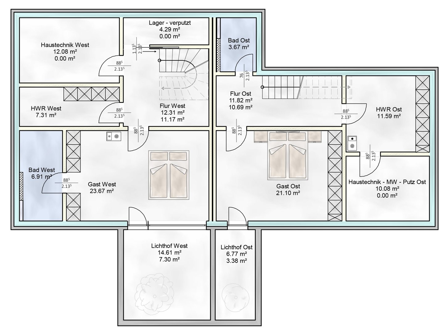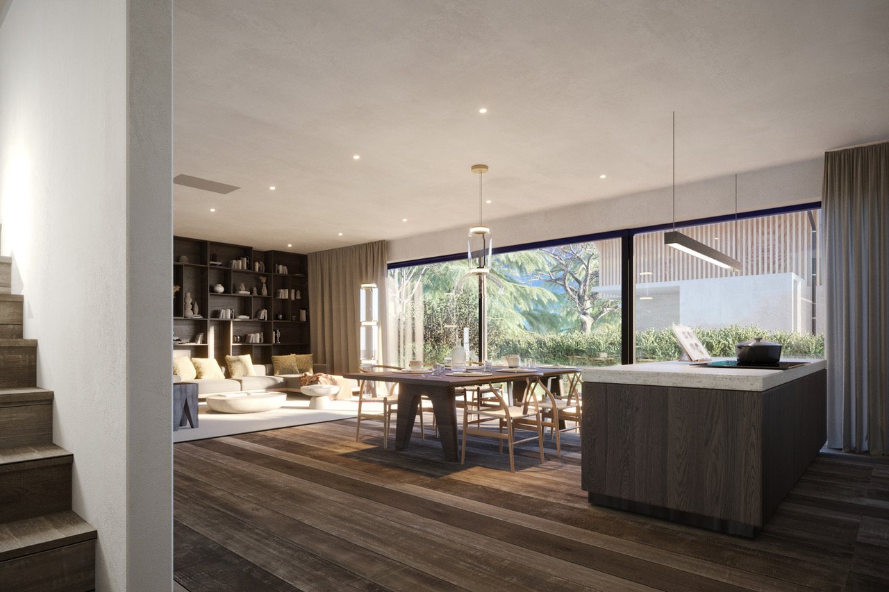 Die Häuser zeichnen sich durch eine klare Architektur und einen geräumigen Grundriss mit durchdachten Details aus: Genannt seien hier die individuelle Gestaltung der Fassade oder auch der Lichthof ins Untergeschoss. Eine moderne Haustechnik mit Luftwärmepumpe und Raffstores an allen Fenstern sind Beispiele für die umfangreichen Ausstattungsdetails.