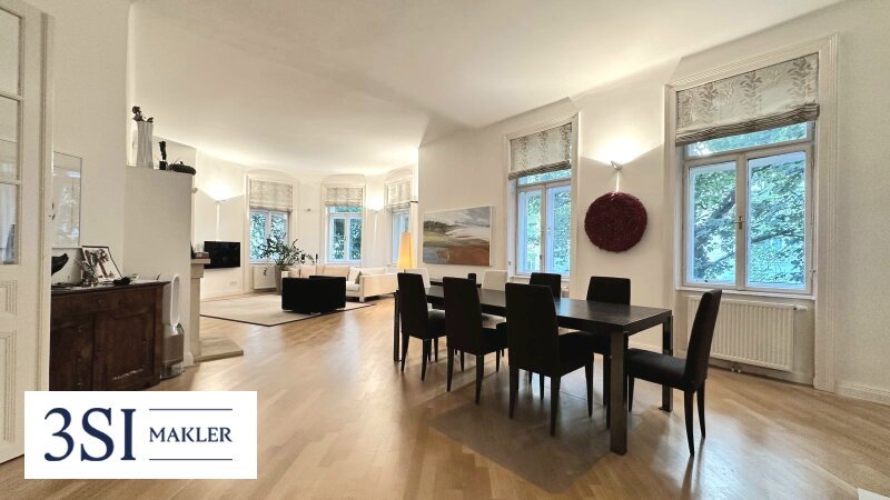Diese exklusive ca. 150 m² große Wohnung mit einer knapp 10 m² Loggia, die in den idyllischen Innenhof – Ihre persönliche grüne Oase – ausgerichtet ist, vereint stilvolles Wohnen mit urbaner Eleganz. Die lichtdurchfluteten Räume, bestehend aus zwei großzügigen Zimmern und einem eleganten Wohnsalon, bieten höchsten Komfort und eine hochwertige Ausstattung mit edlen Parkettböden. Der Wohnsalon ist mit einem offenen Kamin ausgestattet, der für behagliche Atmosphäre und gemütliche Abende sorgt. Die offene Küche ist dennoch geschickt vom Wohnsalon abgetrennt und bietet eine separate, funktionale Raumaufteilung. Sie ist vollständig mit hochwertigen Geräten ausgestattet (die vorhandene Küche kann optional übernommen werden) und verfügt über großzügigen Stauraum, ideal für die Zubereitung von kulinarischen Köstlichkeiten und gesellige Zusammenkünfte. Das moderne Badezimmer mit Eckbadewanne lädt zum Entspannen ein, während der praktische Abstellraum zusätzlichen Komfort garantiert. Die Wohnung, die bis vor Kurzem bewohnt war, befindet sich in einem hervorragenden, gepflegten Zustand und ist sofort bezugsbereit. Die Loggia eröffnet einen ruhigen Rückzugsort im Grünen, ideal für entspannte Stunden im Freien.