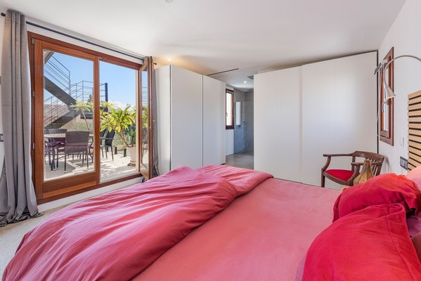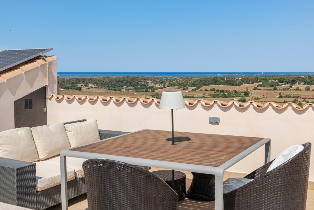 Eine großzügige Terrasse bietet auf dieser Ebene Außenfläche, mit einer Treppe, die zu einer großen Dachterrasse führt, von der aus man einen wunderschönen Ausblick auf die Umgebung hat. Die Sonnenuntergänge von hier aus sind wirklich spektakulär.