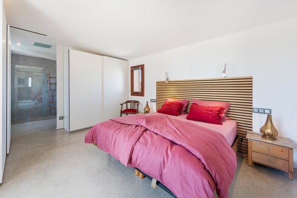 Im ersten Obergeschoss befindet sich der Hauptwohnbereich, der dank der erhöhten Lage des Hauses einen wunderschönen Panoramablick auf das Umland und die Bucht bietet. Diese Etage umfasst eine offene Küche mit Ess- und Wohnbereich, ein Gäste-WC, eine Speisekammer und das Hauptschlafzimmer mit eigenem Bad.