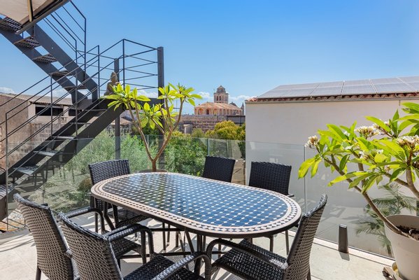 Eine großzügige Terrasse bietet auf dieser Ebene Außenfläche, mit einer Treppe, die zu einer großen Dachterrasse führt, von der aus man einen wunderschönen Ausblick auf die Umgebung hat. Die Sonnenuntergänge von hier aus sind wirklich spektakulär.