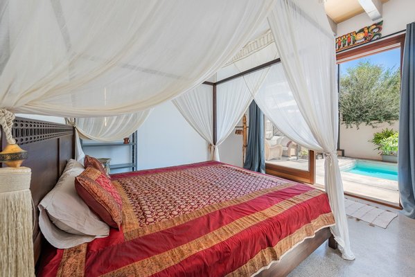 Im Erdgeschoss befinden sich zwei derzeit als Büros genutzte Räume, beide mit Glastüren, die sich leicht in Schlafzimmer umwandeln lassen. Ebenfalls auf dieser Ebene gibt es ein komplettes Badezimmer mit Dusche und Badewanne. Vom Erdgeschoss aus gelangt man in einen privaten Patio mit überdachter Terrasse und einem Salzwasserpool. Auf der gegenüberliegenden Seite liegt ein separates Gästezimmer mit eigenem Zugang über die Garage, ideal für Besucher. Die Garage bietet Platz für zwei Autos und verfügt über ein Obergeschoss, das renoviert und vielseitig genutzt werden kann.