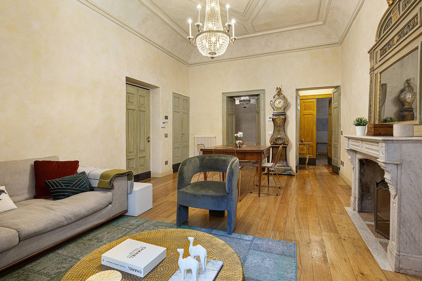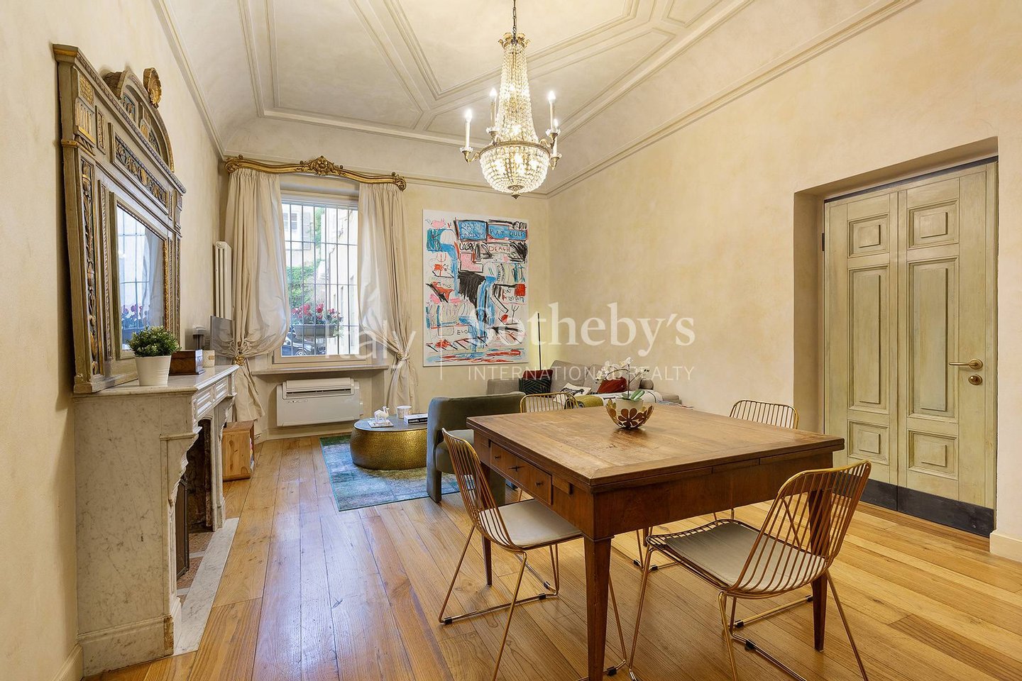 Der Eingang öffnet sich zu einem warmen und einladenden Ambiente mit Parkettboden, einem Wohnzimmer mit hohen, dekorierten Decken, Kamin und ruhigem Blick auf einen Innenhof. Die separate, gut organisierte Küche grenzt an den Schlafbereich, der aus einem Hauptschlafzimmer, einem zweiten Zimmer - ideal als Büro - sowie zwei eleganten Bädern mit Dusche besteht.