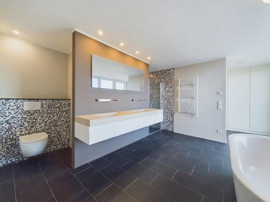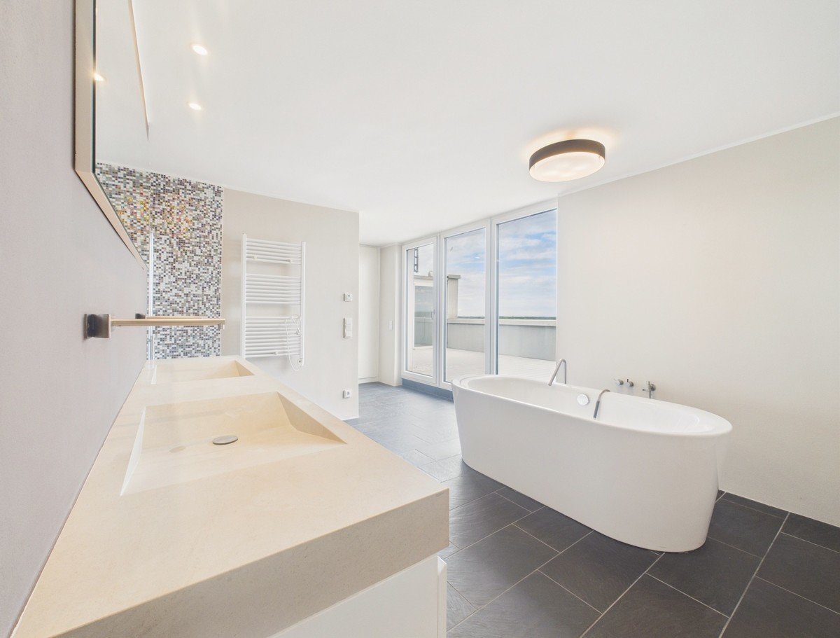 * helles offenes Tageslichtbad mit freistehender Badewanne, Toilette, Dusche und Natursteindoppelwaschbecken
