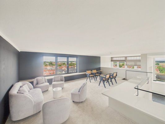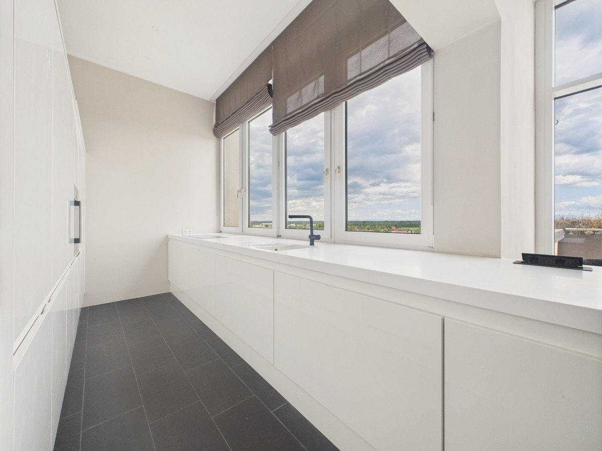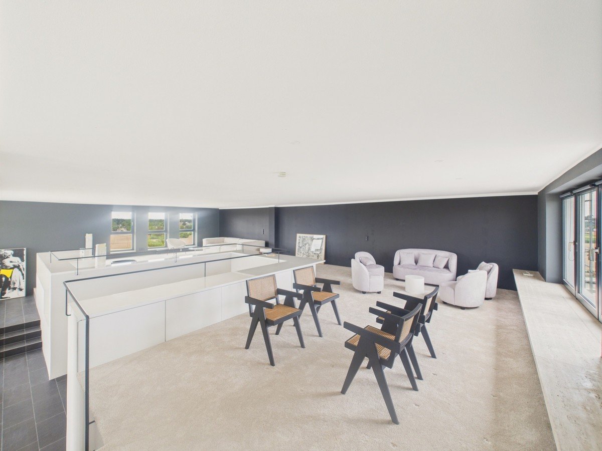 Das Penthouse befindet sich im Obergeschoß eines markanten Gebäudes.
