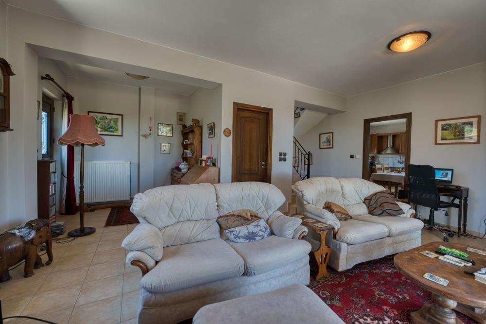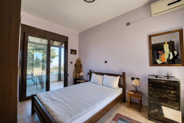 Im Obergeschoss verfügt das Hauptschlafzimmer über einen eigenen Balkon mit Meerblick. Die beiden weiteren Schlafzimmer sind hell und luftig und somit ideal für Familie oder Gäste. Eine große Veranda an der Vorderseite bietet einen Panoramablick auf die umliegenden Hügel und das Dorf, während eine zweite Veranda an der Rückseite den Blick auf die üppige Landschaft freigibt. Diese vielfältigen Außenbereiche ermöglichen es Ihnen, die natürliche Schönheit der Gegend den ganzen Tag über aus verschiedenen Blickwinkeln zu erleben.