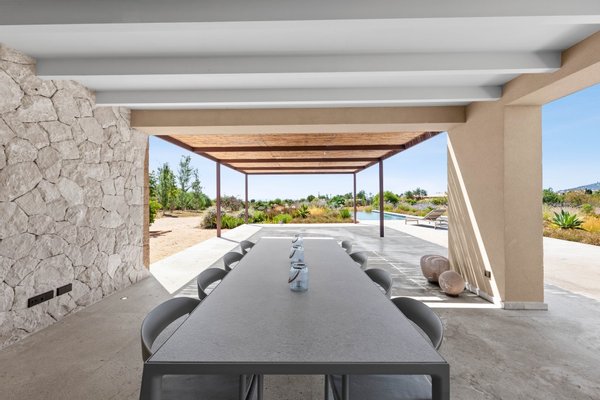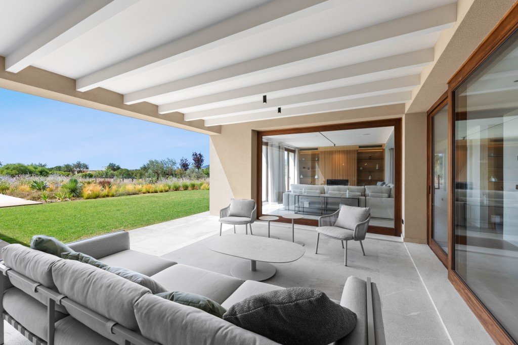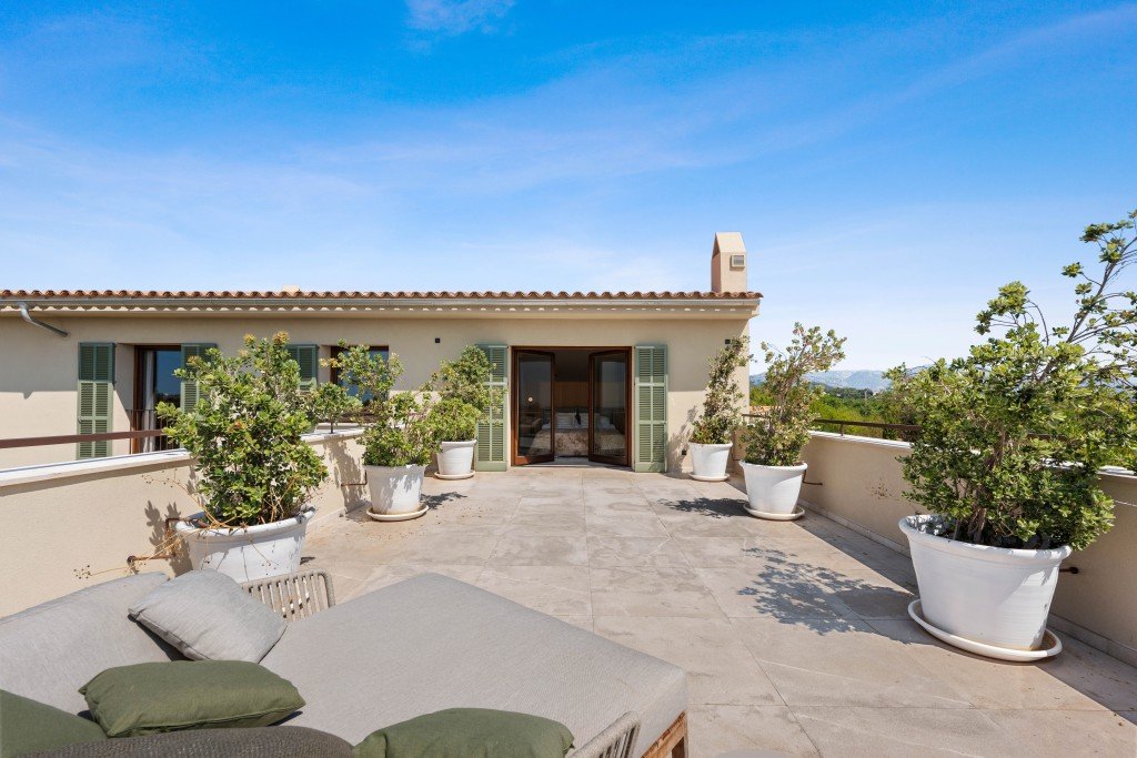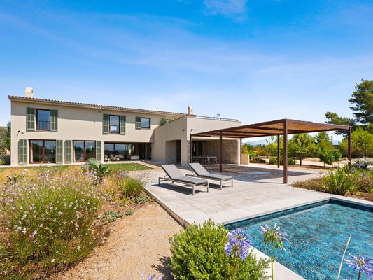 Die Außenbereiche sind mit viel Liebe zum Detail im Sinne des authentischen mallorquinischen Lebensstils gestaltet. Der üppige Garten beherbergt eine Vielzahl einheimischer Pflanzen wie Oliven-, Feigen-, Zitrus- und Avocadobäume. Der Infinity-Pool lädt zum Erholen und Erfrischen ein, während die großzügige Terrasse perfekt für Mahlzeiten im Freien und sonnige Tage ist. Für Golfbegeisterte bietet das Anwesen sogar eine eigene Übungsfläche auf dem Grundstück.