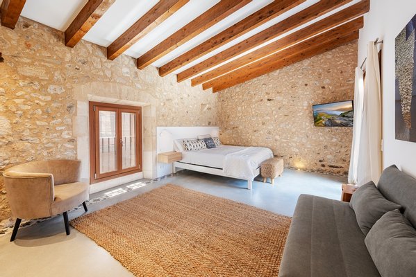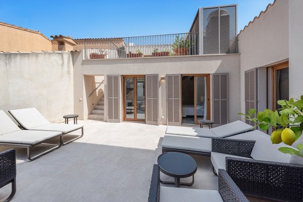 Im Obergeschoss befinden sich drei gut ausgestattete Schlafzimmer, jedes mit eigenem Bad, sowie ein viertes Schlafzimmer mit separatem Bad. Ein zusätzliches Wohnzimmer auf dieser Etage bietet weiteren Raum zum Entspannen. Die obere Terrasse bietet einen malerischen Blick über die Dächer von Pollensa und ist somit der perfekte Ort für Zusammenkünfte bei Sonnenuntergang.