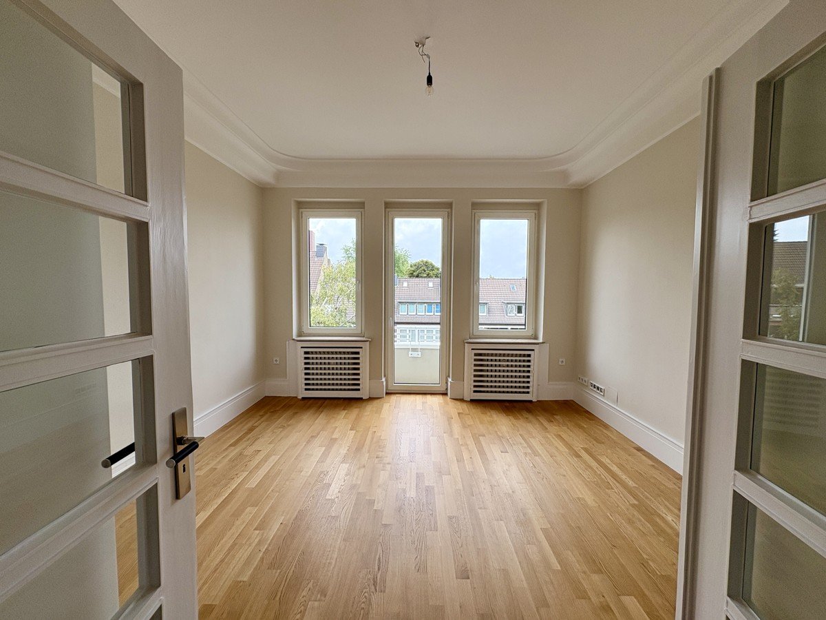 Diese luxuriöse Altbauwohnung mit einer Wohnfläche von ca. 210 m² steht Ihnen ab dem 01.09.2025 zur Verfügung. Von dem repräsentativen Entrée erreichen Sie alle Räume dieser stilvollen Wohnung. Der über eine Schiebetür abteilbare Wohn- Essbereich mit Wintergarten, erstreckt sich über die gesamte Tiefe des Hauses. Vom Wintergarten erreichen Sie die große Terrasse mit elektrischer Markise und Blick in den Garten mit altem Baumbestand. Sowohl das Elternschlafzimmer, als auch das Gästezimmer verfügen jeweils über ein modernes en-Suite Duschbad. Im Elternbad befinden sich die Anschlüsse für Waschmaschine und Trockner. Das Arbeitszimmer kann alternativ als weiteres Schlafzimmer genutzt werden. Die moderne Wohnküche ist mit einer neuen, hochwertigen Einbauküche mit Miele-Elektrogeräten ausgestattet. Die Garderobe sowie das Gäste-WC komplettieren das Raumangebot. Altbauspezifische Stilelemente, wie z.B. hohe Decken mit umlaufenden Stuckprofilen, Holztüren mit Glaseinsätzen und schreinergefertigte Heizkörperverkleidungen, lassen keine Wünsche offen.