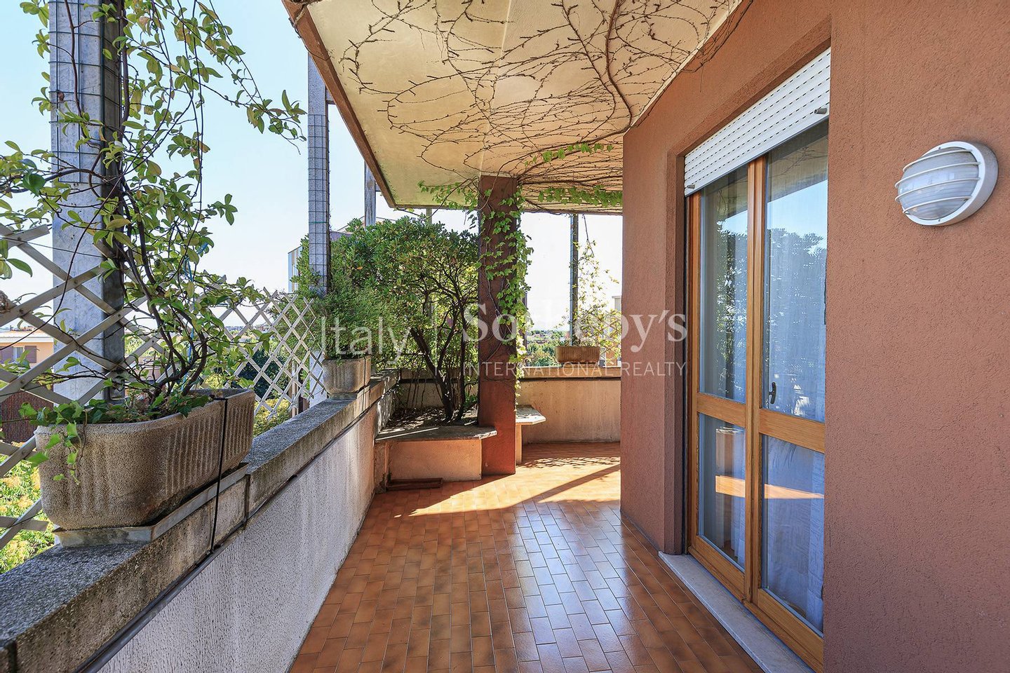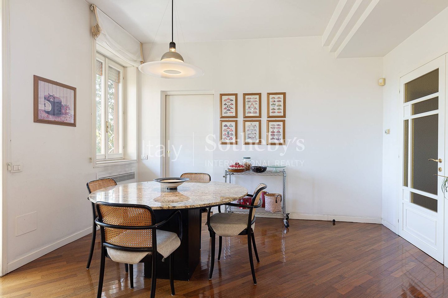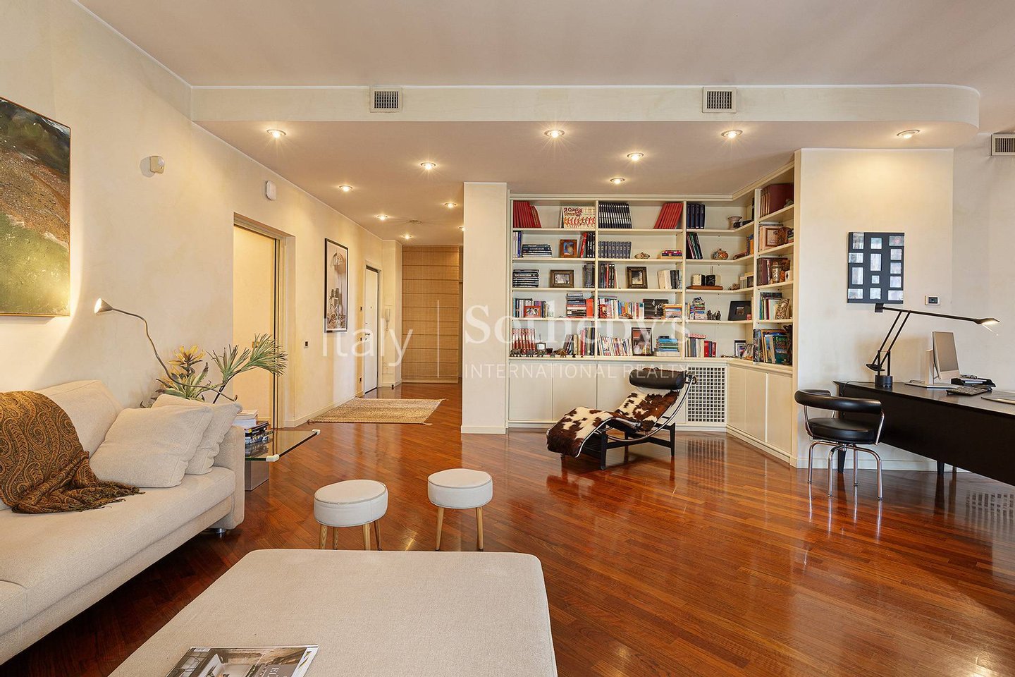 Das Penthouse besteht aus zwei derzeit verbundenen, aber leicht trennbaren Grundbucheinheiten. Die Räume sind harmonisch angeordnet: ein doppellanger Wohnsalon mit Kamin, eine helle Küche im amerikanischen Stil, die in den Essbereich übergeht, ein großzügiger Arbeitsbereich - ideal für das Homeoffice -, sechs Schlafzimmer, fünf Badezimmer, ein Waschraum, Flure mit Einbauschränken und Serviceräume.