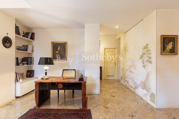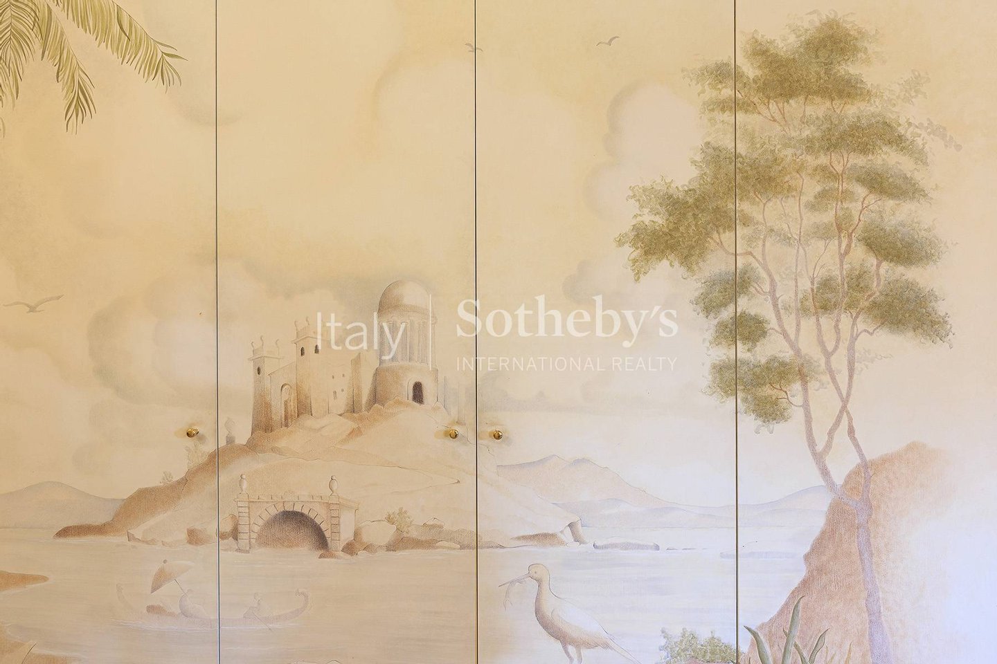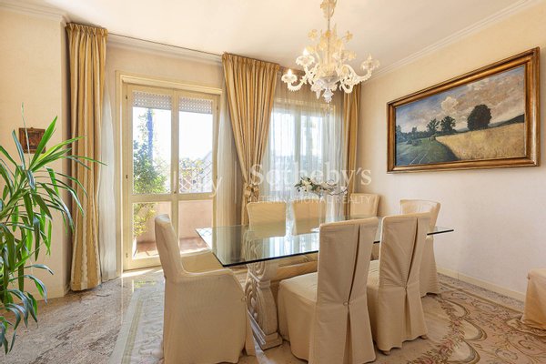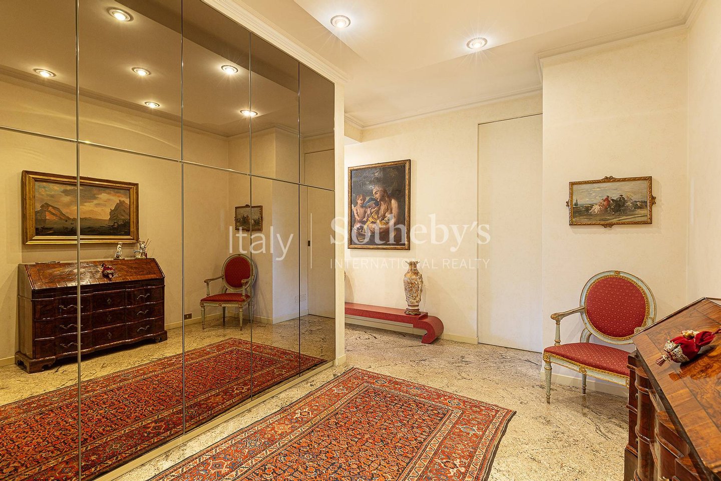 Das Penthouse besteht aus zwei derzeit verbundenen, aber leicht trennbaren Grundbucheinheiten. Die Räume sind harmonisch angeordnet: ein doppellanger Wohnsalon mit Kamin, eine helle Küche im amerikanischen Stil, die in den Essbereich übergeht, ein großzügiger Arbeitsbereich - ideal für das Homeoffice -, sechs Schlafzimmer, fünf Badezimmer, ein Waschraum, Flure mit Einbauschränken und Serviceräume.